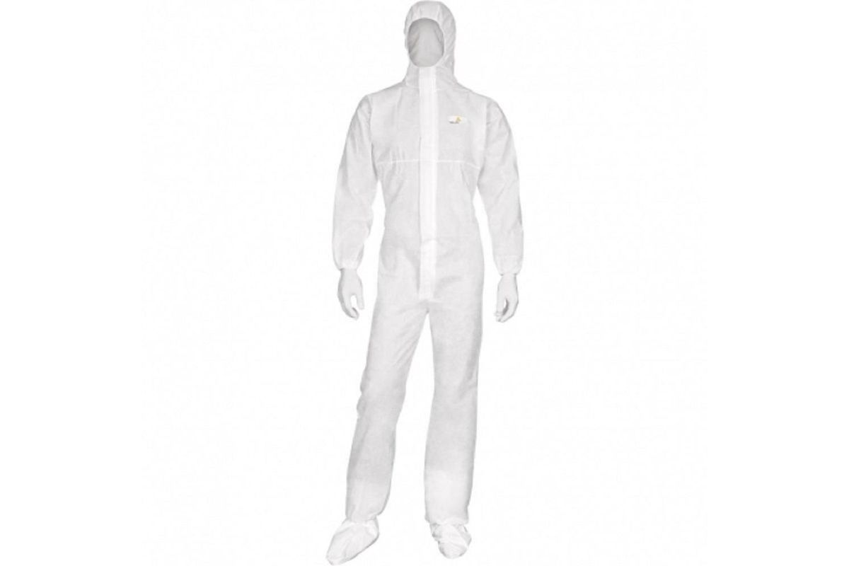Комбинезон с эластичным капюшоном. Нетканый материал – 100% полипропилен. Замок-молния, закрытая защитной планкой. Эластичная резинка вокруг лицевого выреза капюшона, на талии, манжетах рукавов и лодыжках. Индивидуальная упаковка.
