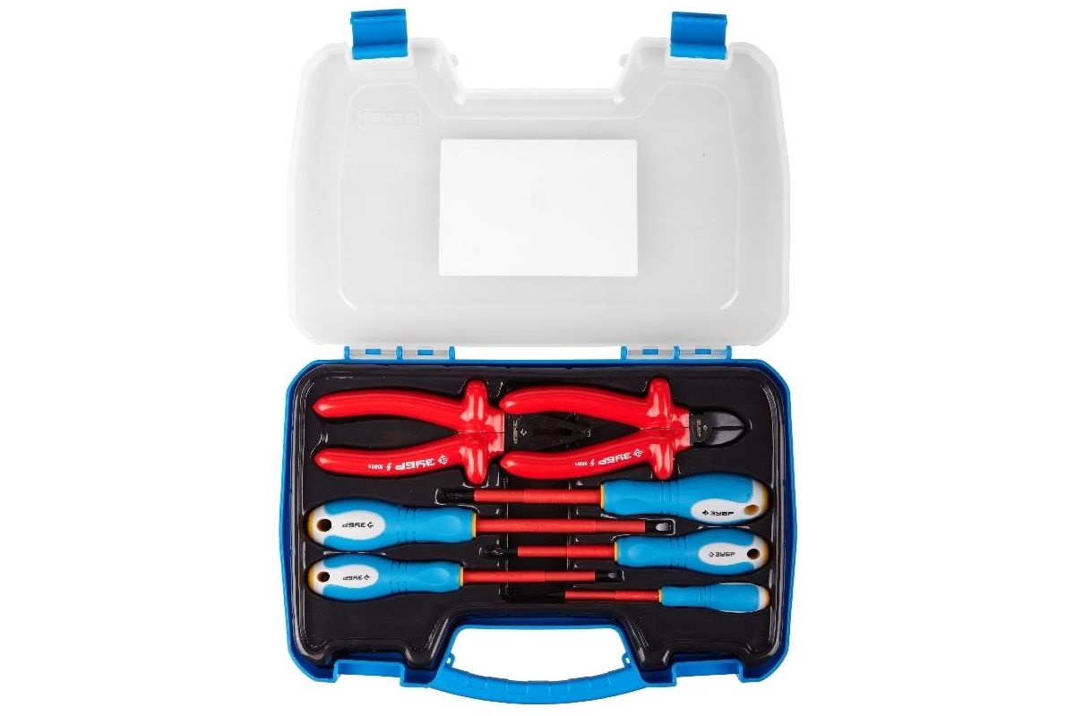 В набор диэл. инструментов ЗУБР 2214-H12 входят: пассатижи, бокорезы, 5 отверток и пластиковый кейс для хранения инструментов. Все инструменты имею изолирующее покрытие, позволяющее работать с сетью до 1000В.