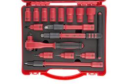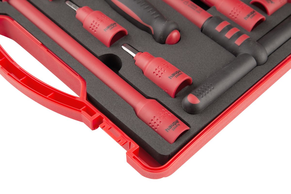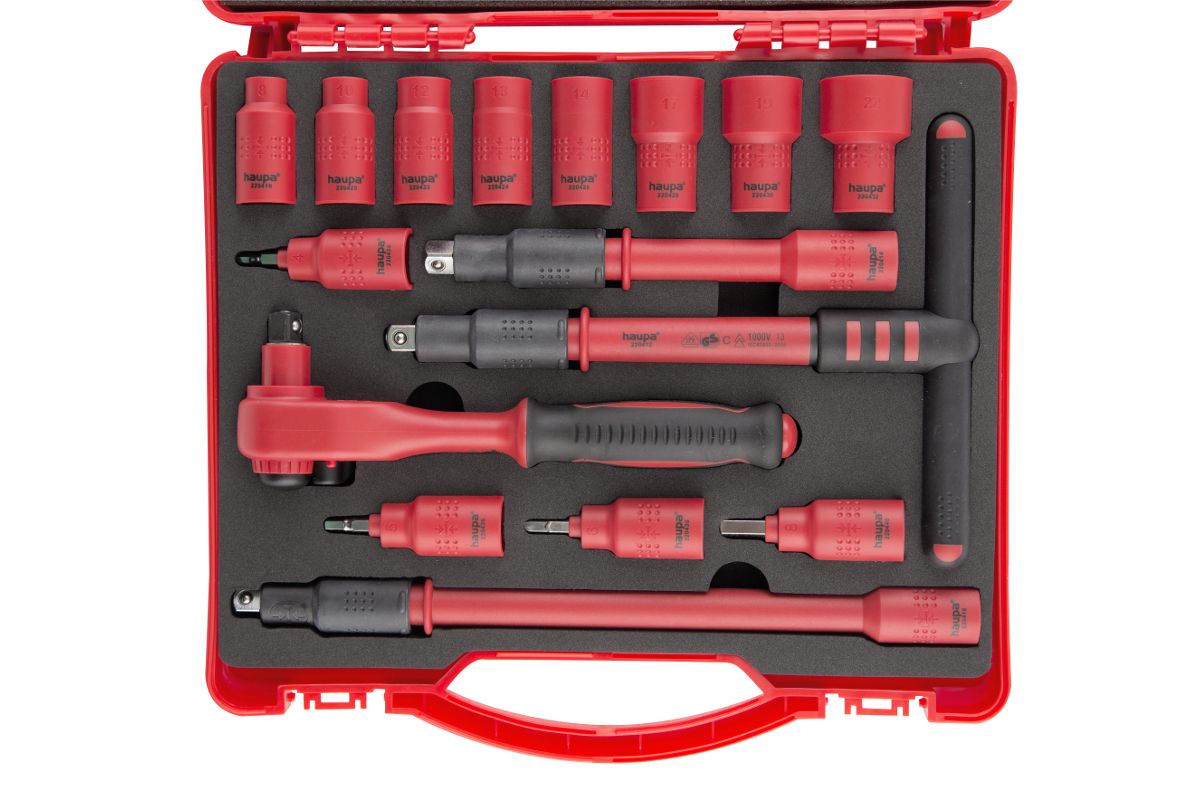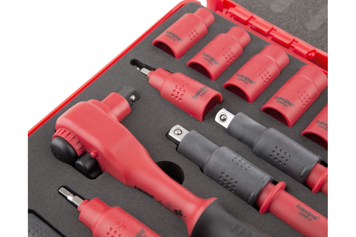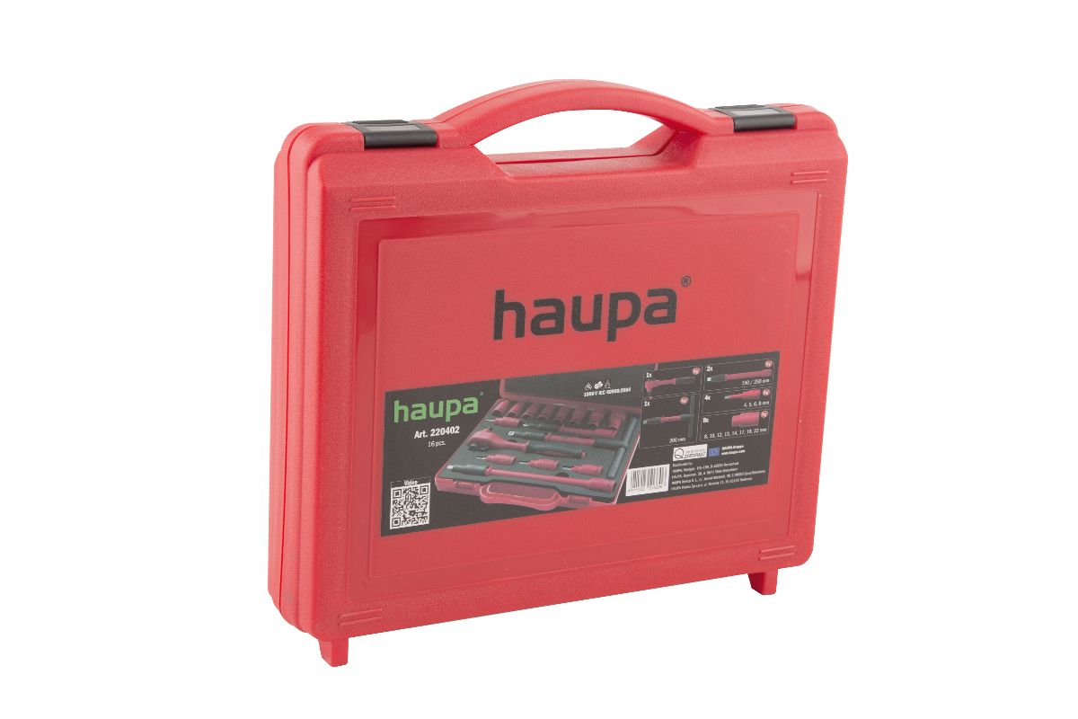 Набор профессионального инструмента HAUPA 220402 предназначен для использования в автосервисе, ремонта и наладки оборудования. Состоит из 16 предметов, среди которых: реверсивный трещоточный ключ, Т-образный ключ, торцевые головки, 2 удлинителя и насадки для винтов. Типоразмер всех насадок — 3/8 дюйма. Используемый в наборе пластик ударопрочен и морозостоек (до -40 °C). Все принадлежности поставляются в фирменном кейсе.