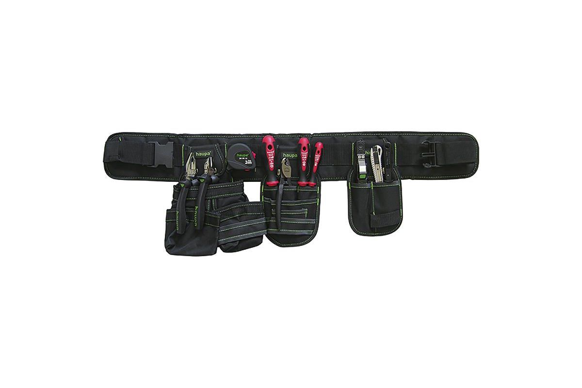 HAUPA 220280 – набор электромонтажного инструмента, размещенный в тканевом поясе. Набор применяется для работы с проводом и кабелем, а также для монтажа и демонтажа резьбовых соединений. Благодаря наличию 10 карманов, пользователь может удобно разместить все необходимые принадлежности. Ношение такого пояса освобождает руки во время работы. Вес модели – 2,11 кг.