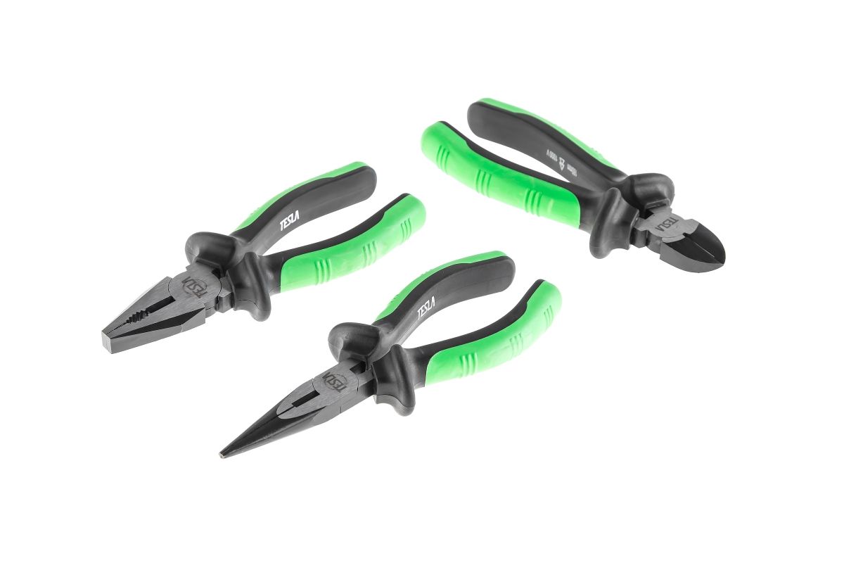 Шарнирно-губцевый инструмент подходящего для бытового электромонтажа размера. В комплект входят плоскогубцы, узкогубцы и бокорезы.