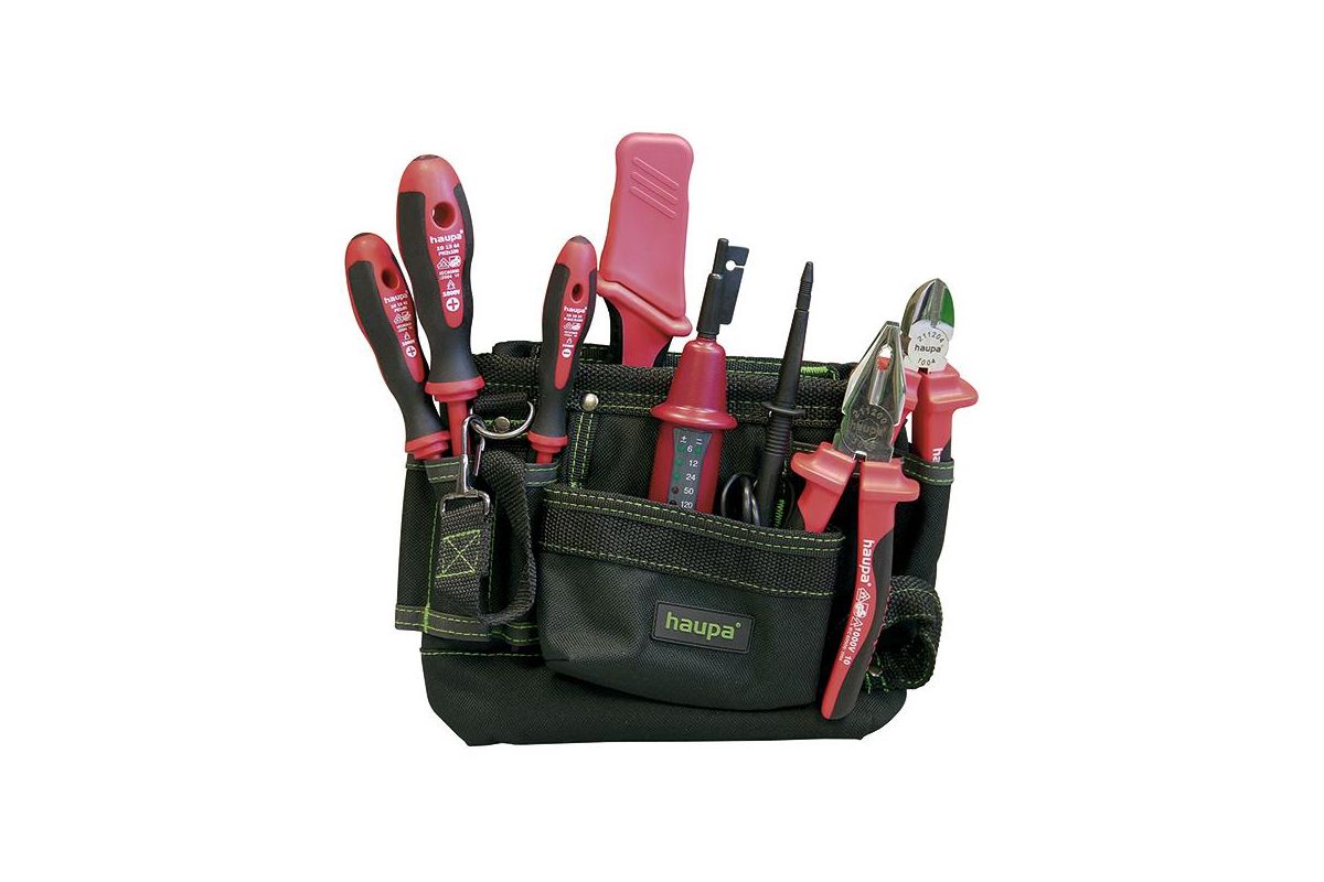 HAUPA 220211 – набор инструментов для электромонтажа и ремонтных работ. Поставляется в эргономичной сумке из полиэстера. Каждый инструмент помещён в отдельный карман. Регулируемый ремень позволяет носить сумку на талии.