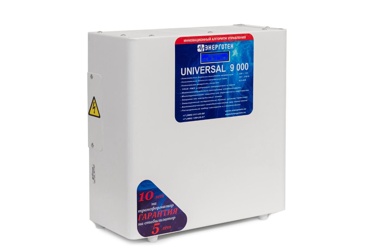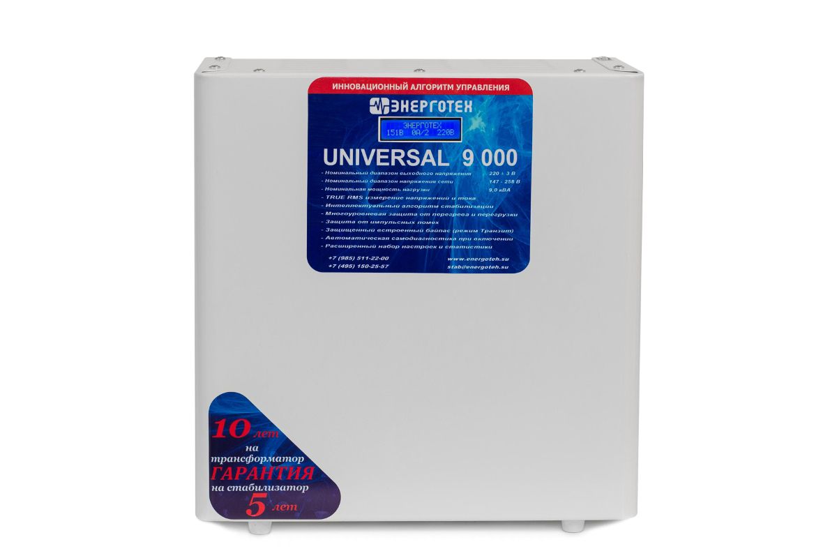 Стабилизатор напряжения ЭНЕРГОТЕХ UNIVERSAL 9000 ±3 В. 147-258 В. время реакции 20 мс. Дисплей
