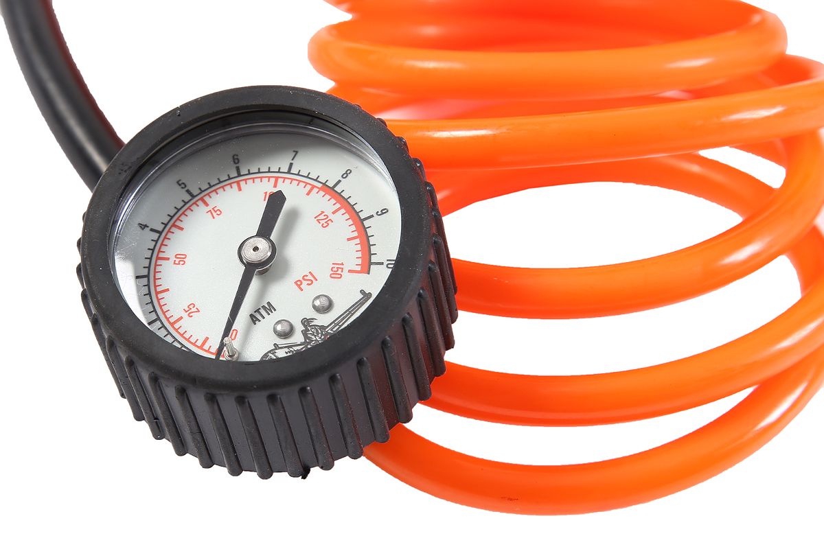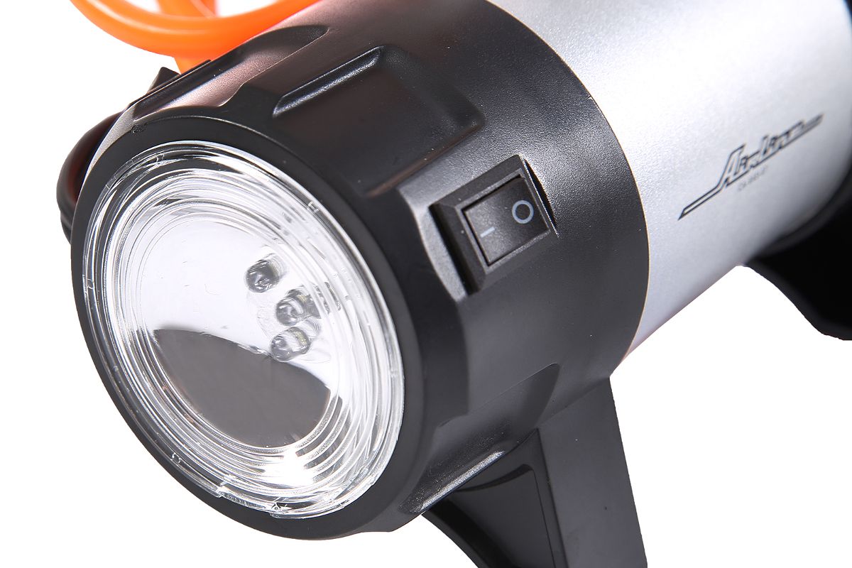 Компрессор оборудован съемным манометром. Встроенный светодиодный фонарь пригодится, если необходимо накачать шины в темное время суток.