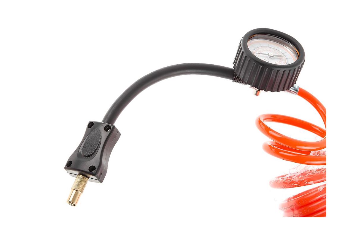 - Встроенный высокоточный двушкальный манометр помогает определить давление, а перепускной клапан сбрасывает избыточное давление в шинах.