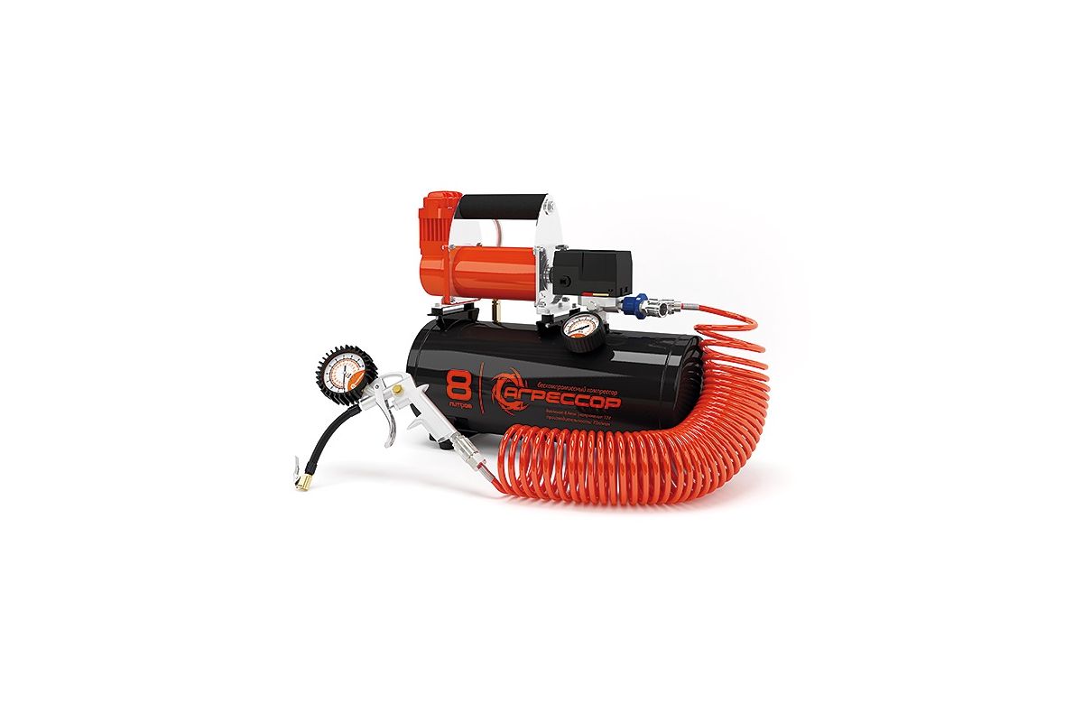 Компрессор АГРЕССОР AGR-8LT металл 8л 12V 480W шланг10м пистолет для шин переходник для пневматики