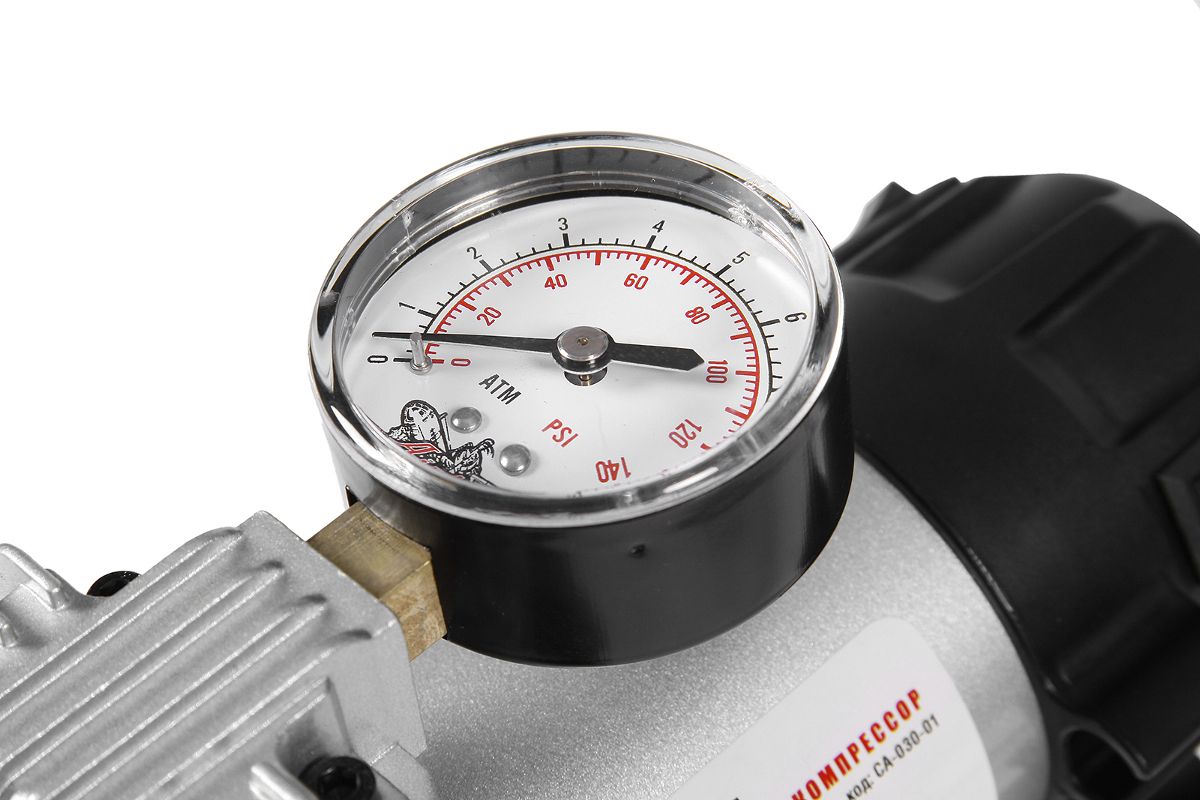 Компрессор имеет встроенный высокоточный манометр ATM PSI с двумя шкалами.