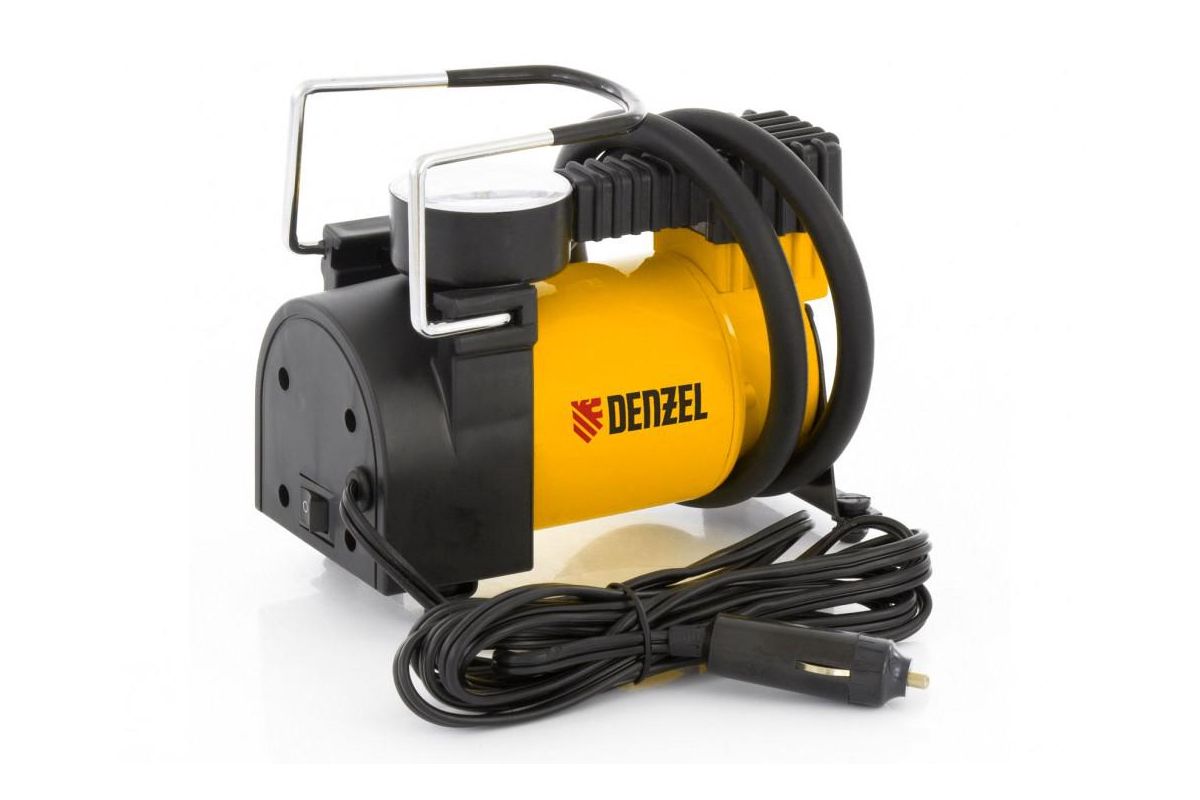 Компрессор состоит из металлического бака, манометра, гибкого шланга для подкачки, рабочего узла (в ударопрочном пластиковом корпусе) и шнура питания с насадкой под прикуриватель. Рабочее давление агрегата – 10 бар. Воздушный компрессор Denzel 58054 DC-20 имеет производительность в 35 л/мин. Этого вполне достаточно, чтобы быстро подкачать колеса легкового автомобиля.