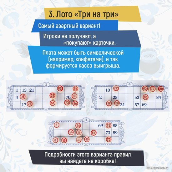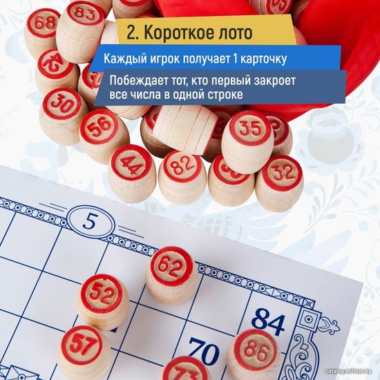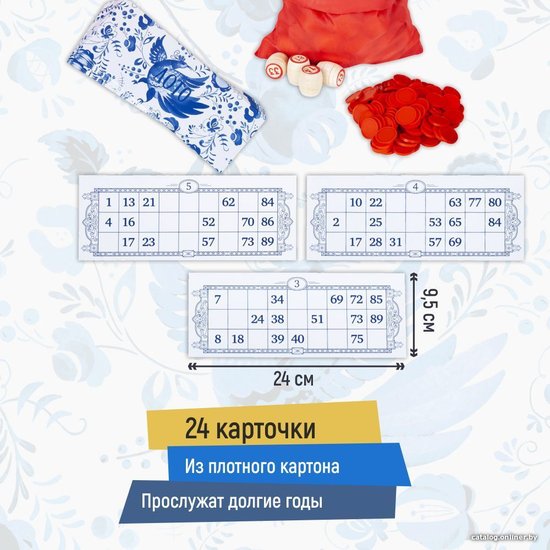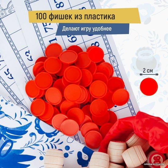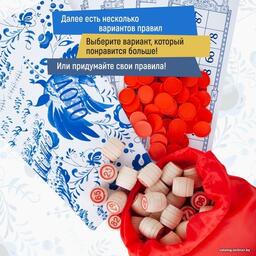 • Комплектация 90 деревянных бочонков в мешке 24 карточки 100 жетонов-закрывашек