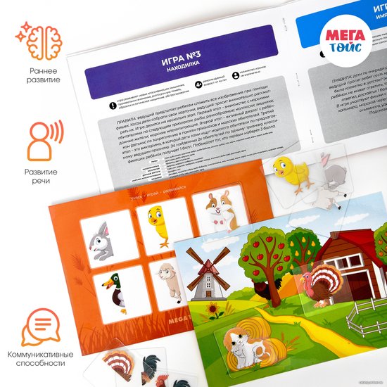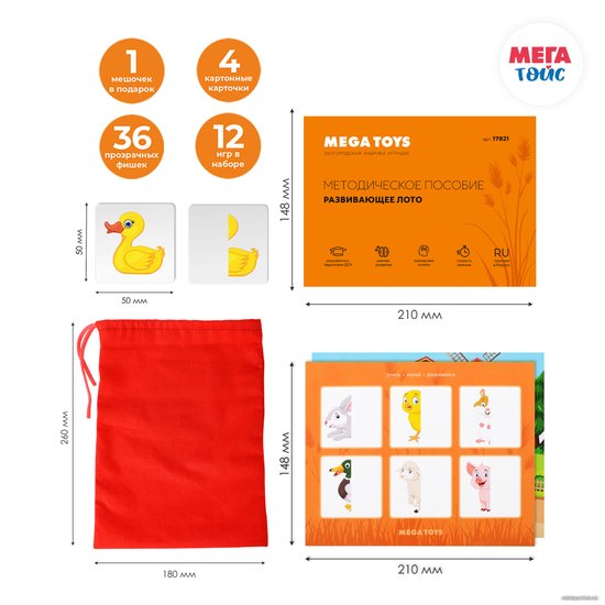 • Комплектация Карточки прозрачные, размер 50x50 мм — 36 штКарточки двухсторонние картонные формат А5 — 4 штМешочек из 100 % хлопка — 1 штОбучающее пособие с играми — 1 штУпаковка размером 190x275 мм