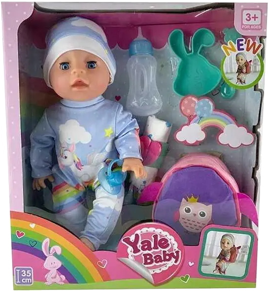 - В комплекте с куклой горшок, подгузник, бутылочка для кормления, пустышка, рюкзак / тарелка, ложка /