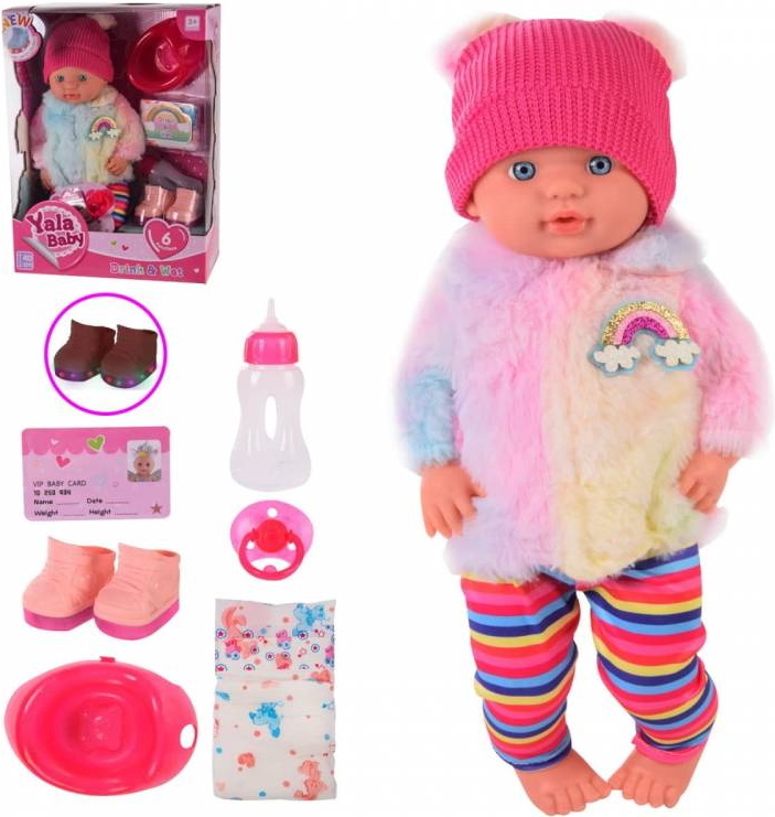 - В комплекте с куклой дополнительная одежда/обувьгоршок, подгузник, бутылочка для кормления, пустышка