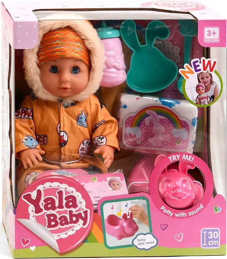 - В комплекте с куклой горшок, подгузник, бутылочка для кормления, пустышка, тарелка / ложечка /