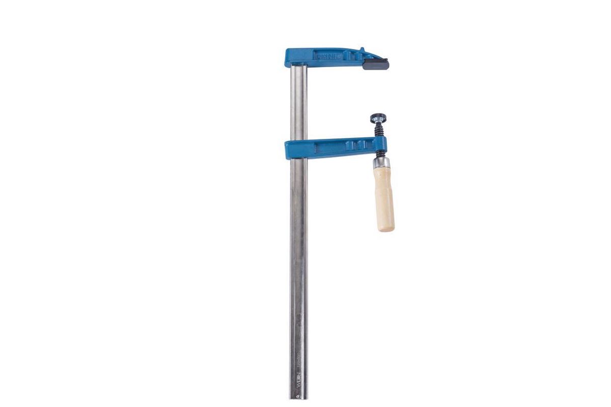 Универсальная F-образная струбцина для фиксации деталей при сборке и их сжатия при склеивании. Имеет прямую профилированную направляющую с насечками из прочной высоколегированной стали и кованные насадные упоры захвата. Винтовой прижим с износостойкой резьбой трапециевидного профиля. Рабочие поверхности захвата оборудованы съемными пластиковыми накладками.