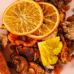 Состав: апельсин сушёный, груша сушёная, корица (палочки), имбирь сушёный, ананас сушёный, изюм, гвоздика, яблоко сушёное.