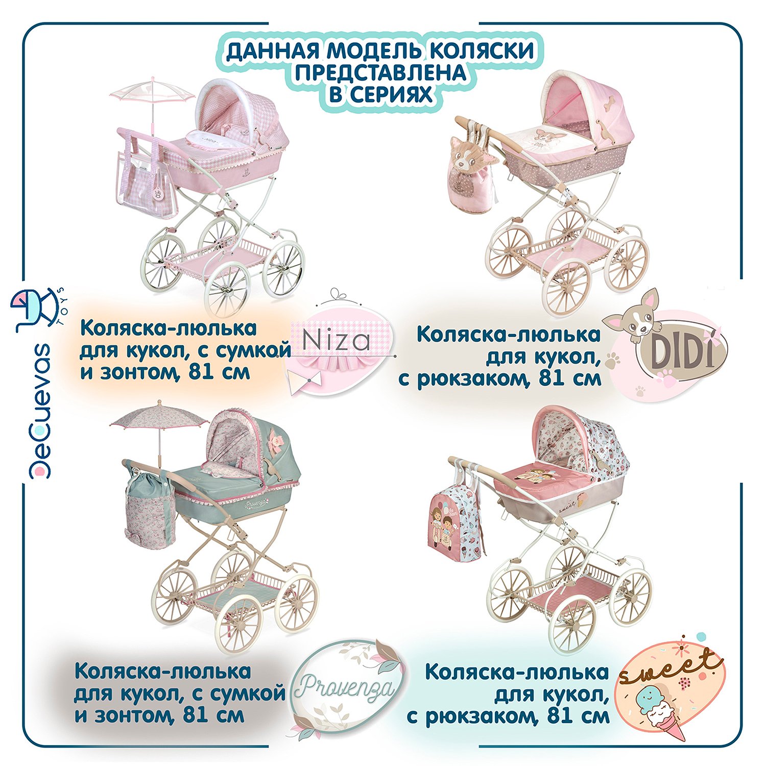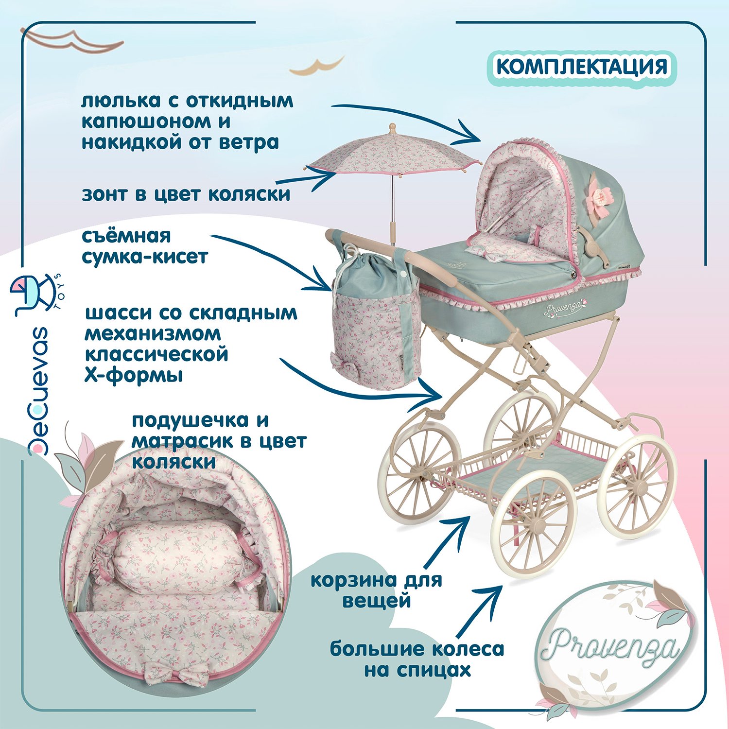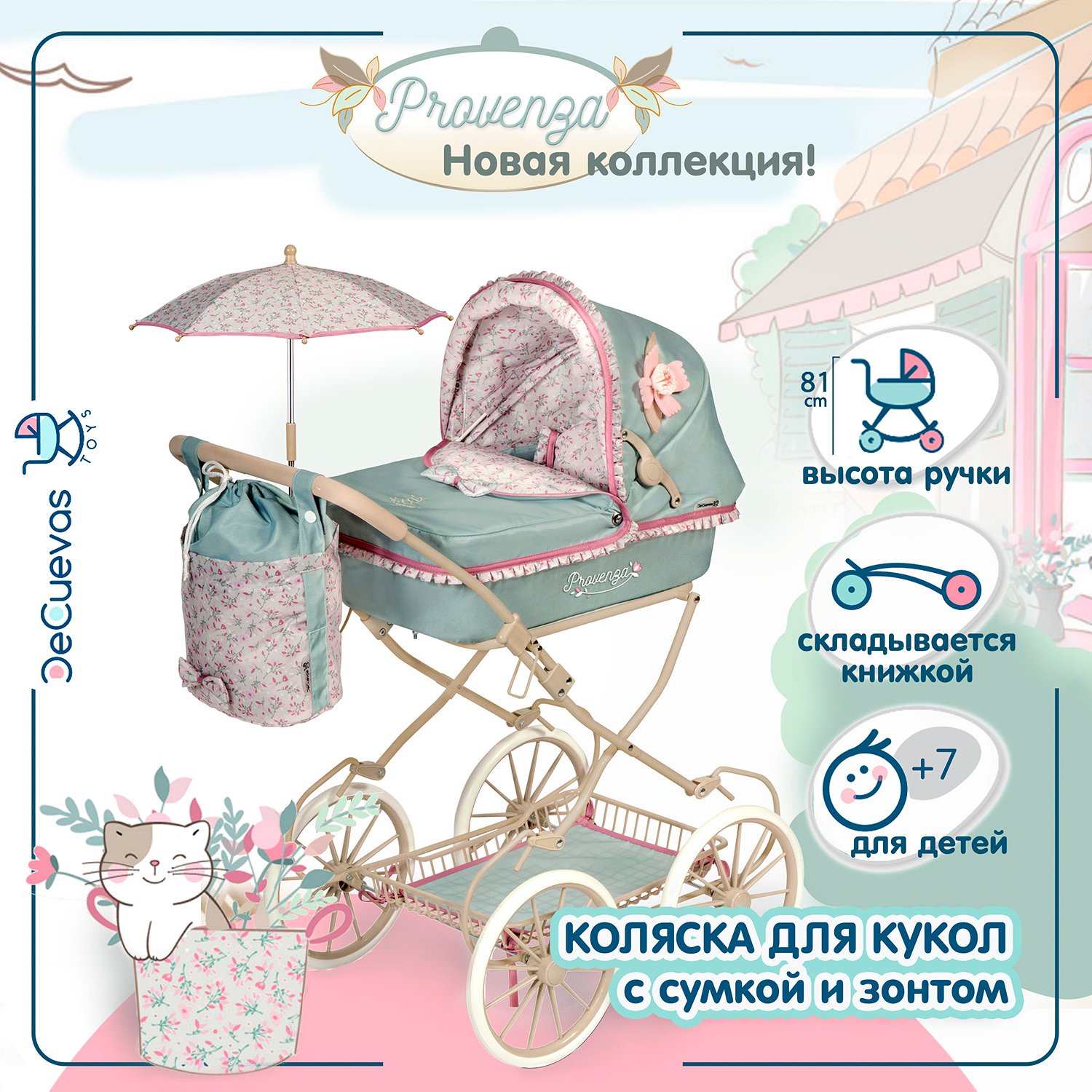 Коляска для кукол DeCuevas Toys люлька с сумкой и зонтом высота ручки 81 см серия Прованс 81045