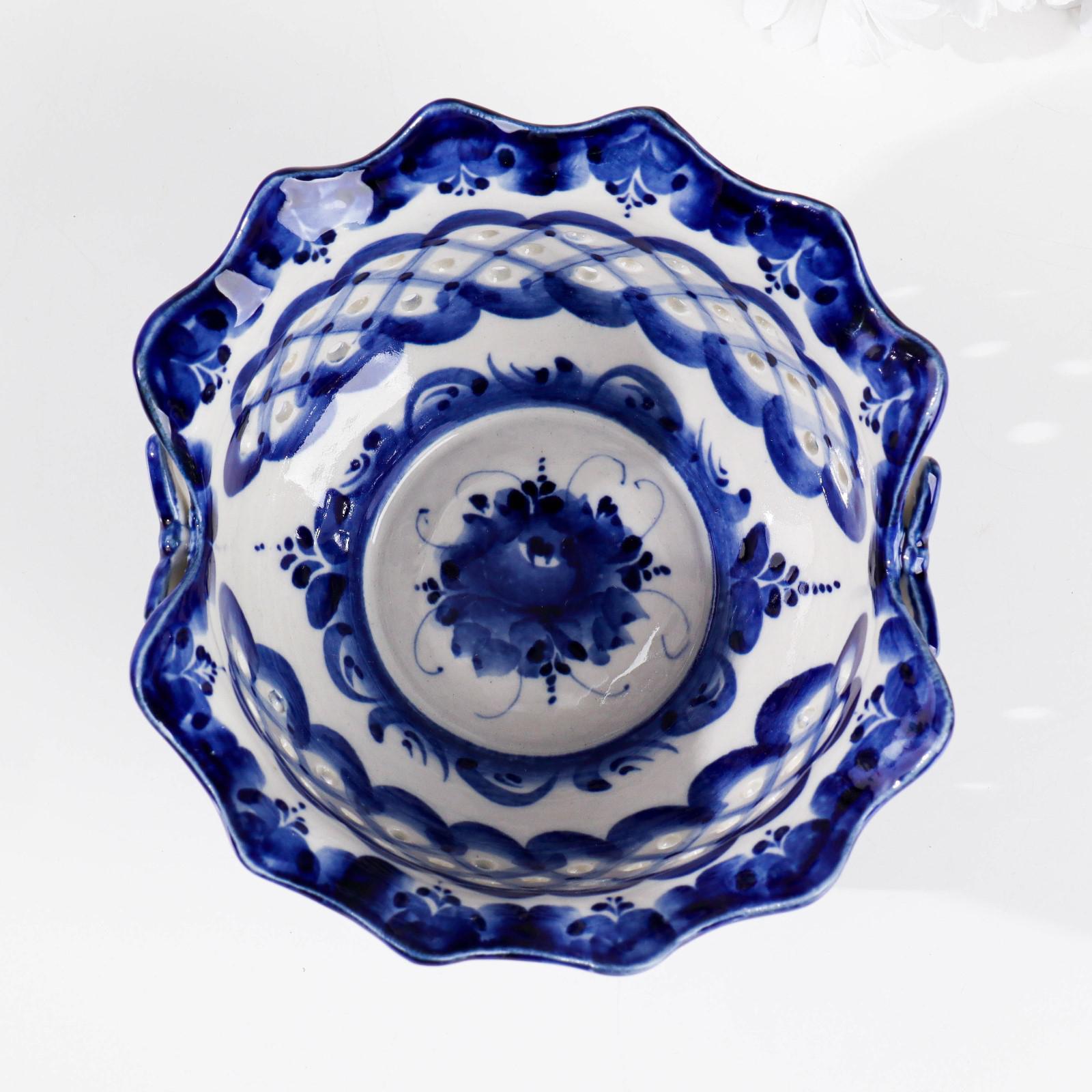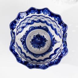Собственный стиль Гжели — синие и голубые узоры, растительный орнамент и витиеватые украшения на белом фоне. В каждом предмете легко и непринуждённо варьируются букеты и гирлянды, вводятся геометрические пояски, похожие на вязаное кружево, изделия украшает декоративная лепнина, изображаются пейзажные сюжеты.
