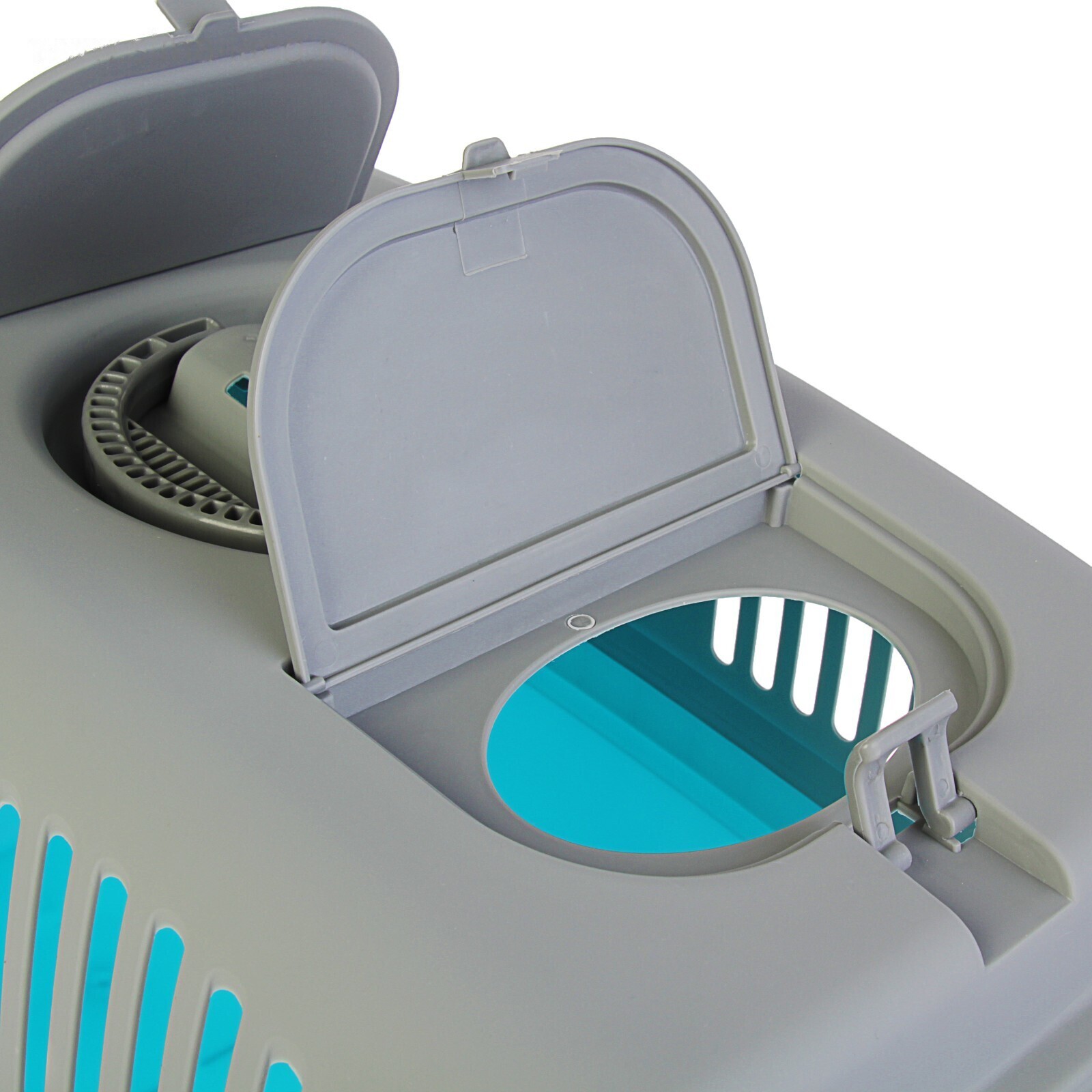 Переноска с 2 люками и креплением для наплечного ремня 58х37х37, до 12 кг, серо-голубая
