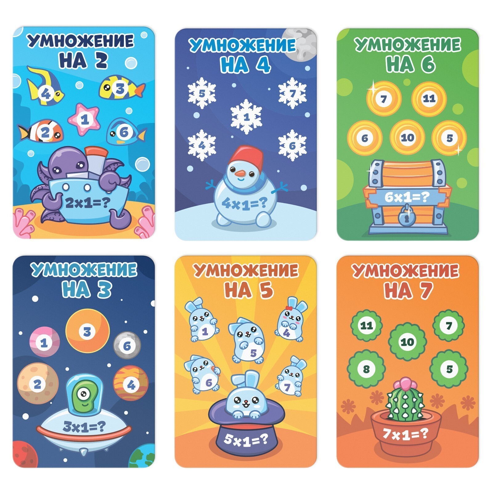 Разделите карточки на 5 колод. На каждой карточке (кроме колоды «Умножай наоборот») снизу находится пример, а выше рассыпано 5 чисел, одно из которых относится к данному примеру. Итак, положите карточку перед ребёнком и попросите его решить пример. Когда вы используете все карточки умножения (от 2 до 9), можно переходить к колоде «Умножай наоборот». Задача ребёнка в этом случае — подобрать число, которое подходит для данного примера. Вы можете перемешивать все карточки или решать примеры на время. Главное, чтобы ребёнку было интересно!