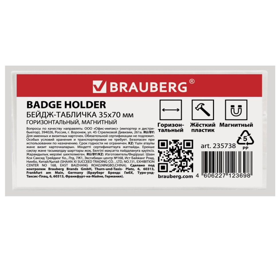 Бейдж-табличка BRAUBERG для именных карточек. Твердый пластик гарантирует долгий срок службы. Будет незаменим для сотрудников гостинично-ресторанного сектора. Тип бейджа: бейдж-табличка. Тип крепления: магнит. Положение: горизонтальное. Длина вкладыша: 70 мм. Ширина вкладыша: 35 мм. Длина бейджа: 71 мм. Ширина бейджа: 36 мм. Цвет крепления: белый. Материал корпуса: твердый пластик. Цвет корпуса: белый. Количество бейджиков в упаковке: 5 шт. Бренд - BRAUBERG. Производитель - Китай. Артикул - 235738. Штрихкод - 4606227123698