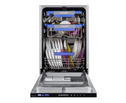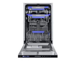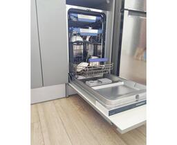 Узкая встраиваемая посудомоечная машина шириной 45 см. В данной модели есть дополнительный выдвижной лоток для столовых приборов. Это позволяет вымыть 10 комплектов посуды. Специально разработанные держатели для бокалов с прорезиненными вставками дают возможность мыть посуду даже из хрупкого стекла. Внутренняя поверхность выполнена из нержавеющей стали толщиной 0.6-0.8 мм, что обеспечит долгий срок службы при активном использовании.
