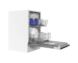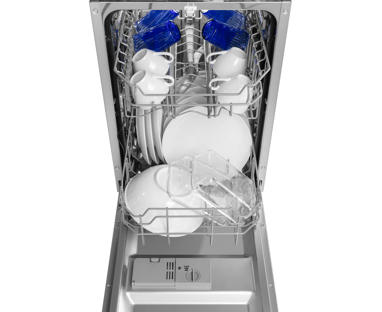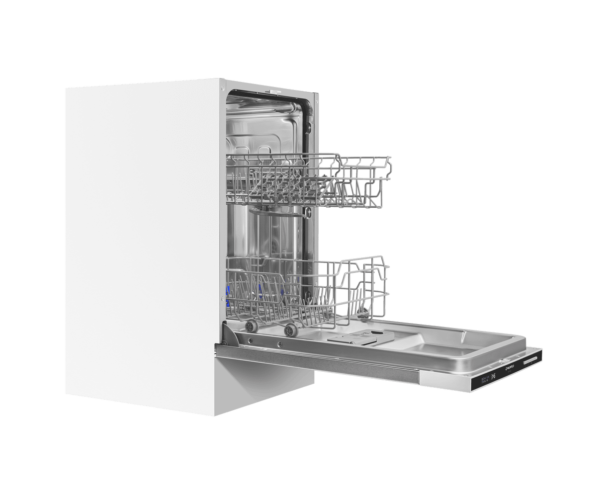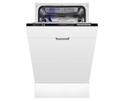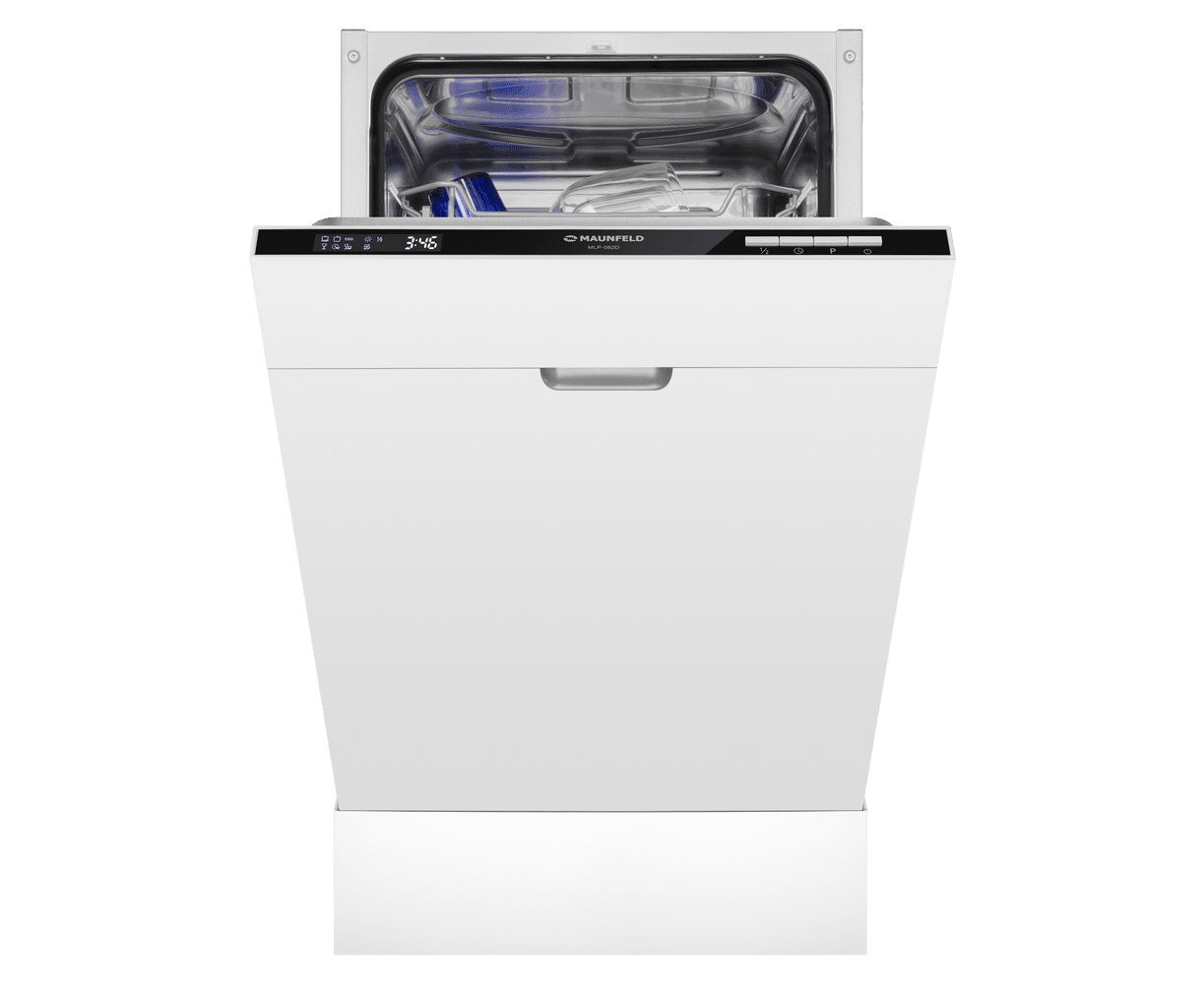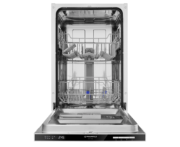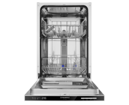 Электронное управление с дисплеем расположено в торце загрузочной дверцы. Функционал данной модели позволяет вам выбрать программу мойки, включить половинную загрузку, выставить время отсрочки старта (1-24 часов).