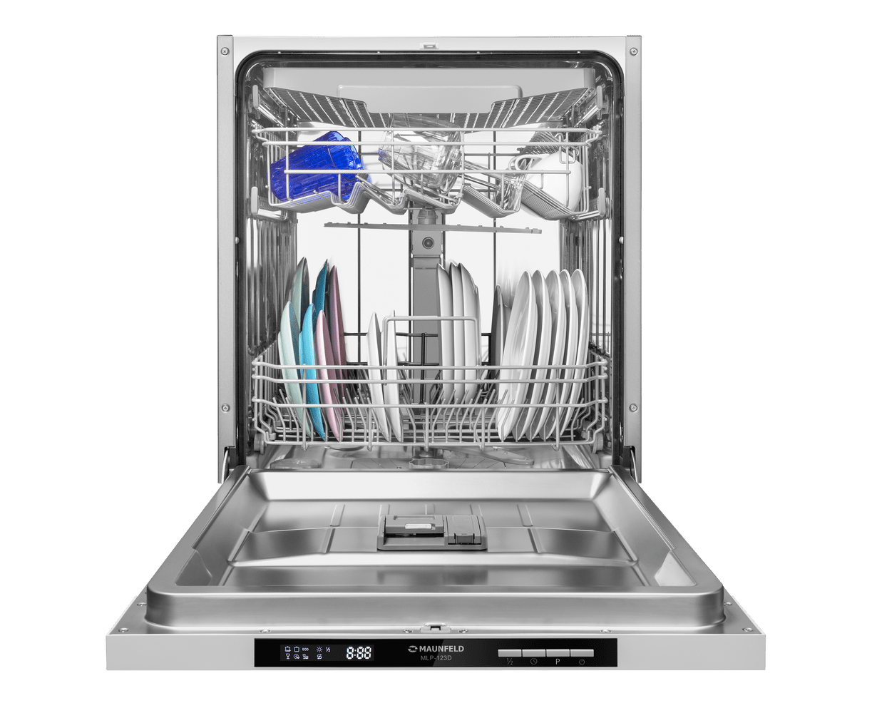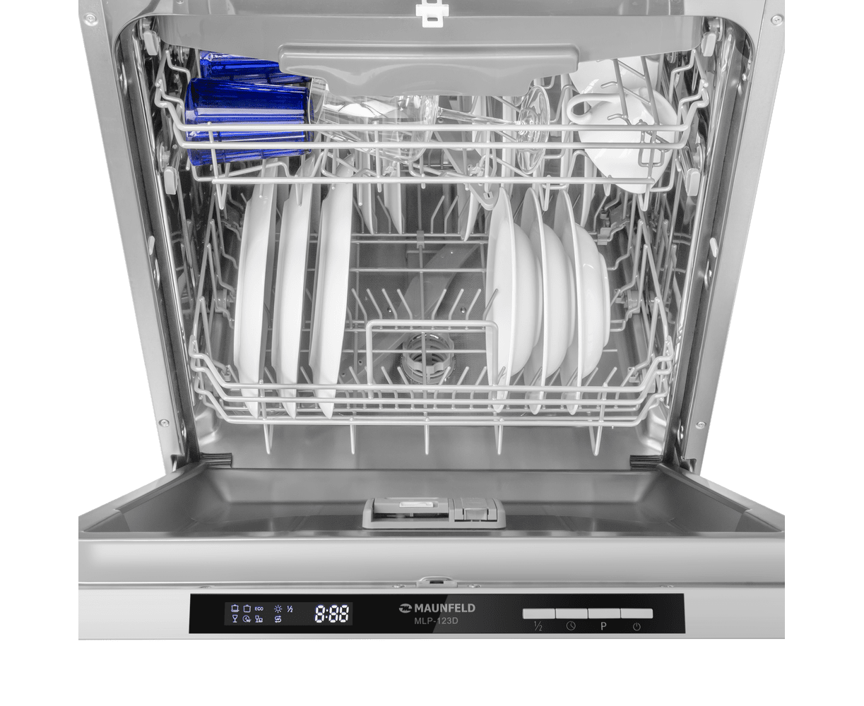 Благодаря использованию специально разработанных корзин и дополнительного выдвижного лотка для столовых приборов MLP-123D позволяет вымыть 14 комплектов посуды.