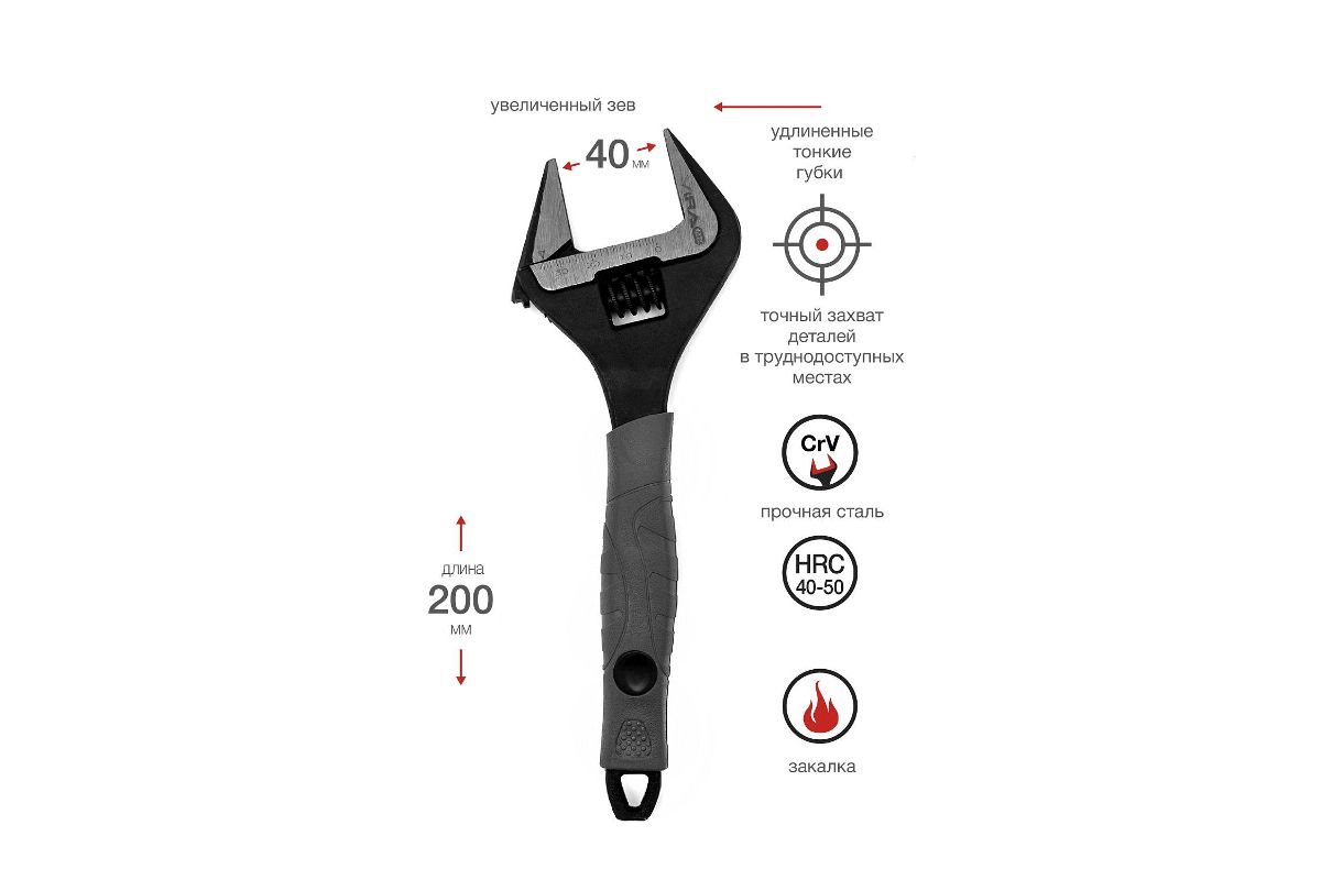 Ключ разводной VIRA 311102 с тонким губками, длина 200 мм, губки 40 мм