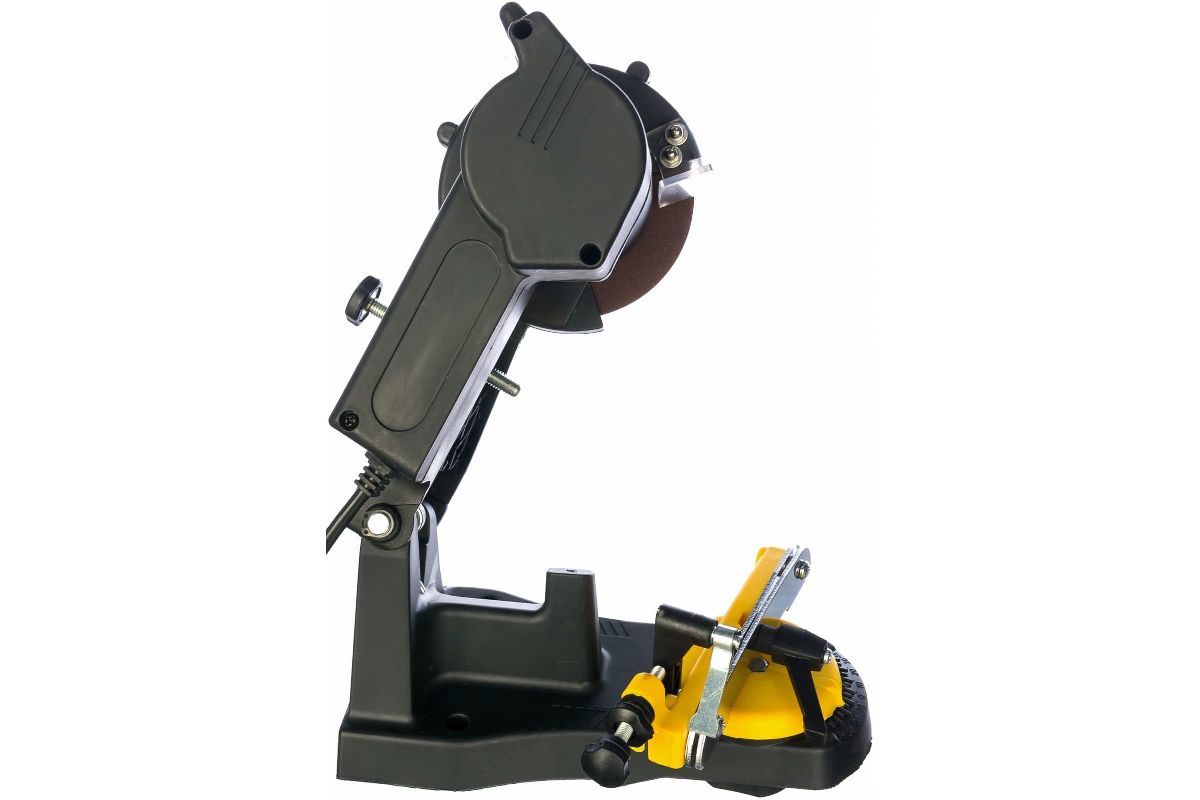 В качестве точильного элемента используется абразивный круг диаметром 105 м. Он вращается с высокой скоростью. Она достигает 4800 об/мин на холостом ходу. Поворотный рабочий стол позволяет проводить заточку цепей под углами от 0 до 35о. Корпус станка выполнен из прочного пластика. Это обеспечивает инструменту надежность и долговечность. Для безопасности оператора абразивный диск закрыт защитным кожухом. Это предотвращает возникновение травм.