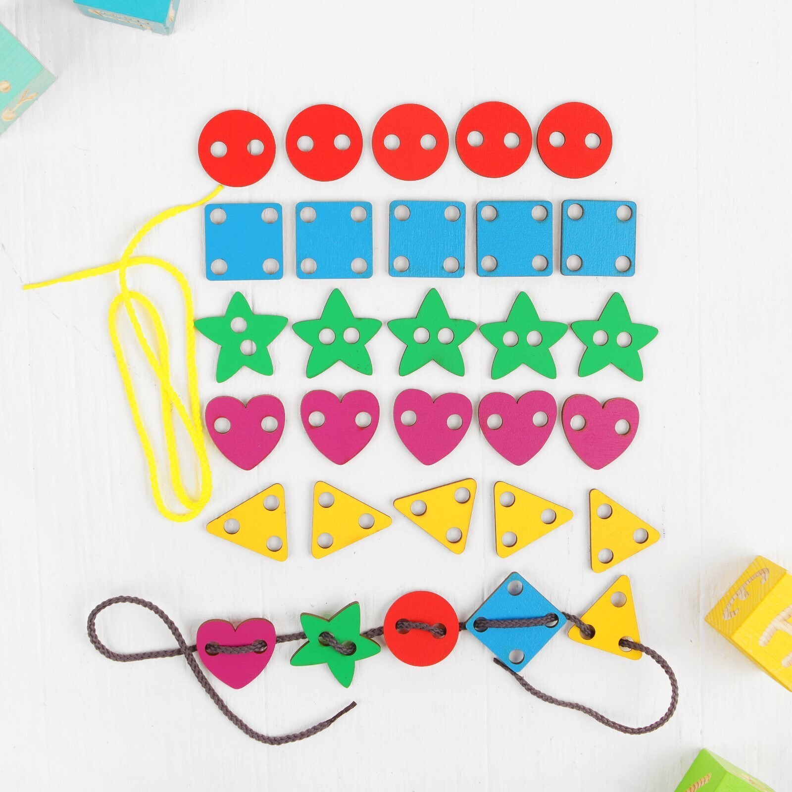 Шнуровка представляет собой развивающую игру, суть которой в том, чтобы нанизывать фигурки на верёвочку в определённом порядке. Попросите малыша выбрать детали одного цвета или формы, а затем усложняйте задания, сочетая разные элементы на одном шнурке.