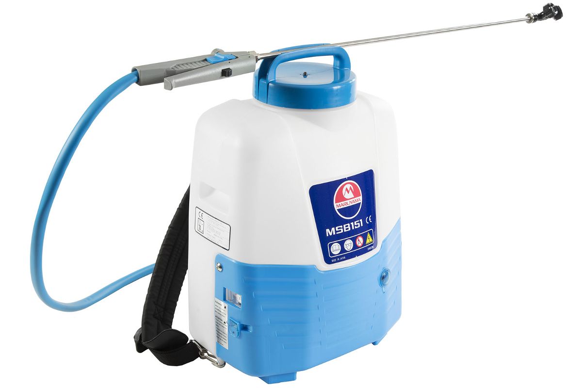 MARUYAMA MSB151 — аккумуляторный опрыскиватель для распыления химикатов и удобрений в оранжереях, теплицах. Опрыскиватель практически бесшумен и не вредит окружающей среде. Модель оснащена лямками, рукояткой со спускным краном и объемным баком. Время беспрерывной работы — до 2 часов. Производительность — 1,5 л/мин. Объем бака — 15 л.
