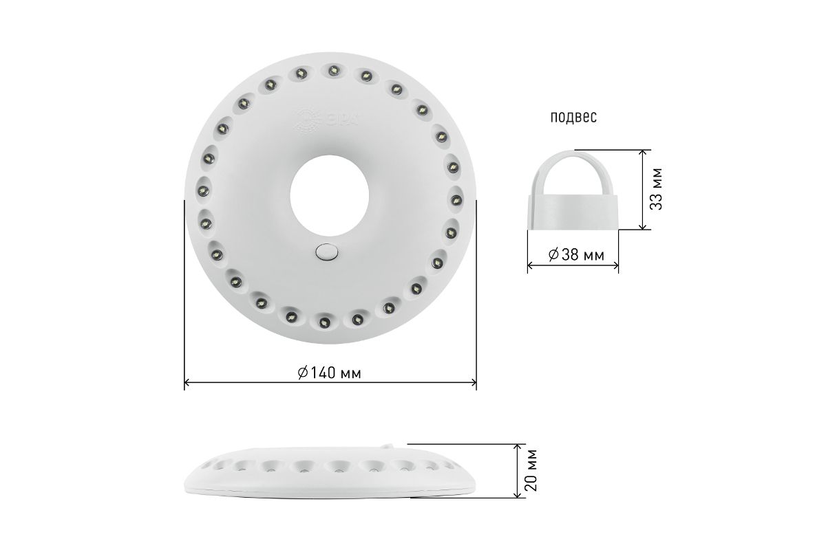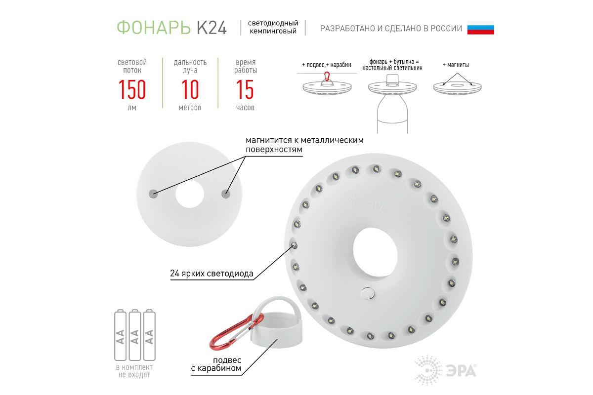Фонарь собственного дизайна ЭРА, ставший одной из самых популярных туристических моделей. Получил народные названия ''НЛО'' или ''Летающая тарелка'' за круглую форму корпуса и футуристический внешний вид. Фонари ЭРА К24 и их блистерная упаковка производятся в России. 24 светодиода эргономично расположены на корпусе в круговом формате. Не перегорают, не требуют замены, разумно расходуют заряд и дают яркое освещение. Особое преимущество и настоящая ''фишка'' ЭРА К24 - в секретах эксплуатации. Фонарь закрепляется при помощи специального кронштейна (подвес + карабин), превращаясь в яркую походную ''люстру''. Для металлических поверхностей в тыльную сторону корпуса вмонтированы магниты. Но самый простой способ использования - закрепить на горлышке бутылки. Тогда это уже импровизированный настольный светильник. Надёжный помощник в походе, на охоте, рыбалке, загородном отдыхе.