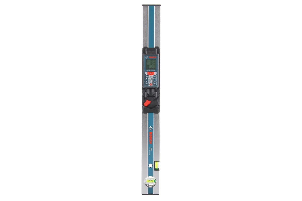 BOSCH GLM 80 – лазерный дальномер с функцией уклономера. Подходит для измерения расстояний (дальность действия до 80 м) и угла наклона плоскости. В наборе с инструментом идет рейка-пузырьковый уровень R60. Ее можно использовать вместе с дальномером (для точной фиксации угла наклона) или как самостоятельный прибор.