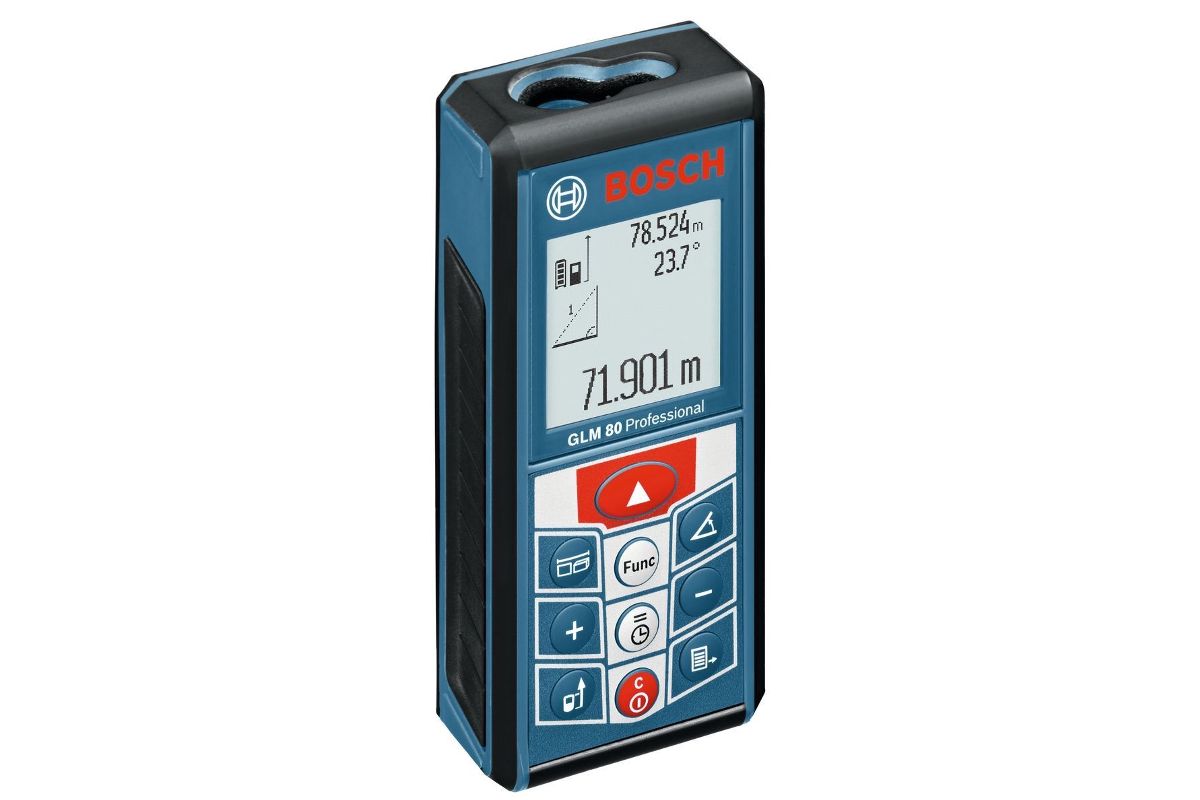 Дальномер BOSCH GLM 80 (лазерная рулетка) необходим для измерения расстояний, площадей, объема, дины, высоты объекта, а так же угла наклона поверхности. Дальность измерений составляет 80 м. Десять последних значений сохраняются автоматически. Встроенный датчик наклона обеспечивает высокую точность и скорость замера углов. Дисплей с подсветкой поворачивается при наклоне дальномера более чем на 75 о . Для работы в сложных условиях предусмотрен таймер.