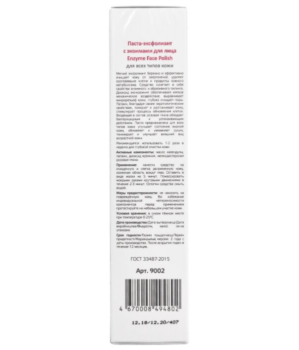 Мягкий эксфолиант бережно и эффективно очищает кожу от загрязнений, удаляет ороговевшие клетки и продукты кожного метаболизма. Средство сочетает в себе свойства энзимного и абразивного пилинга. Диоксид экокремния обеспечивает мягкое механическое воздействие, выравнивает микрорельеф кожи, глубоко очищает поры. Папаин, благодаря своим кератолитическим свойствам, полирует и разглаживает кожу, стимулирует процессы обновления клеток. Входящая в состав розовая глина обладает бактерицидным и успокаивающим действием. Паста предназначена для всех типов кожи: улучшает состояние жирной кожи, обновляет и увлажняет сухую, тонизирует и улучшает внешний вид возрастной кожи.