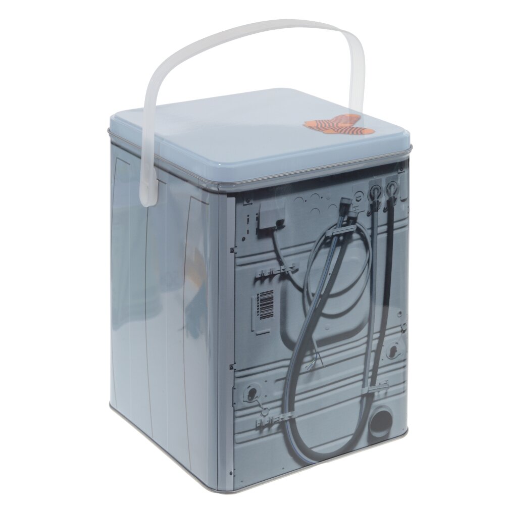 Металлическая банка с изображение стиральной машины идеально подойдет для хранения стирального порошка,а плотно закрывающаяся крышка не допустит попадания влаги.