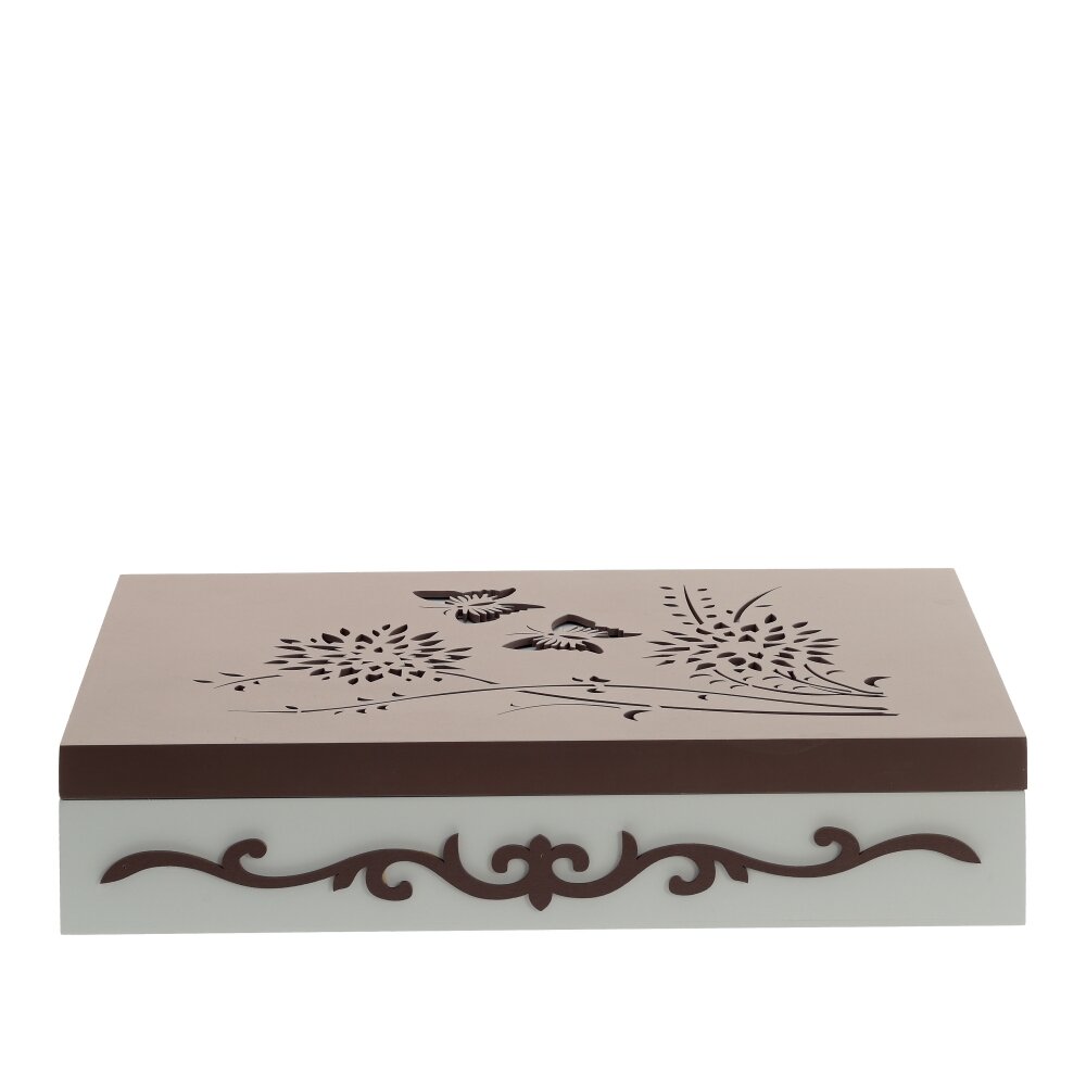 Очаровательная шкатулка для столовых приборов. Внутри три отделения для хранения. Оригинальность шкатулке придает резная крышка. Стильный дизайн позволяет шкатулке стать украшением любой кухни.