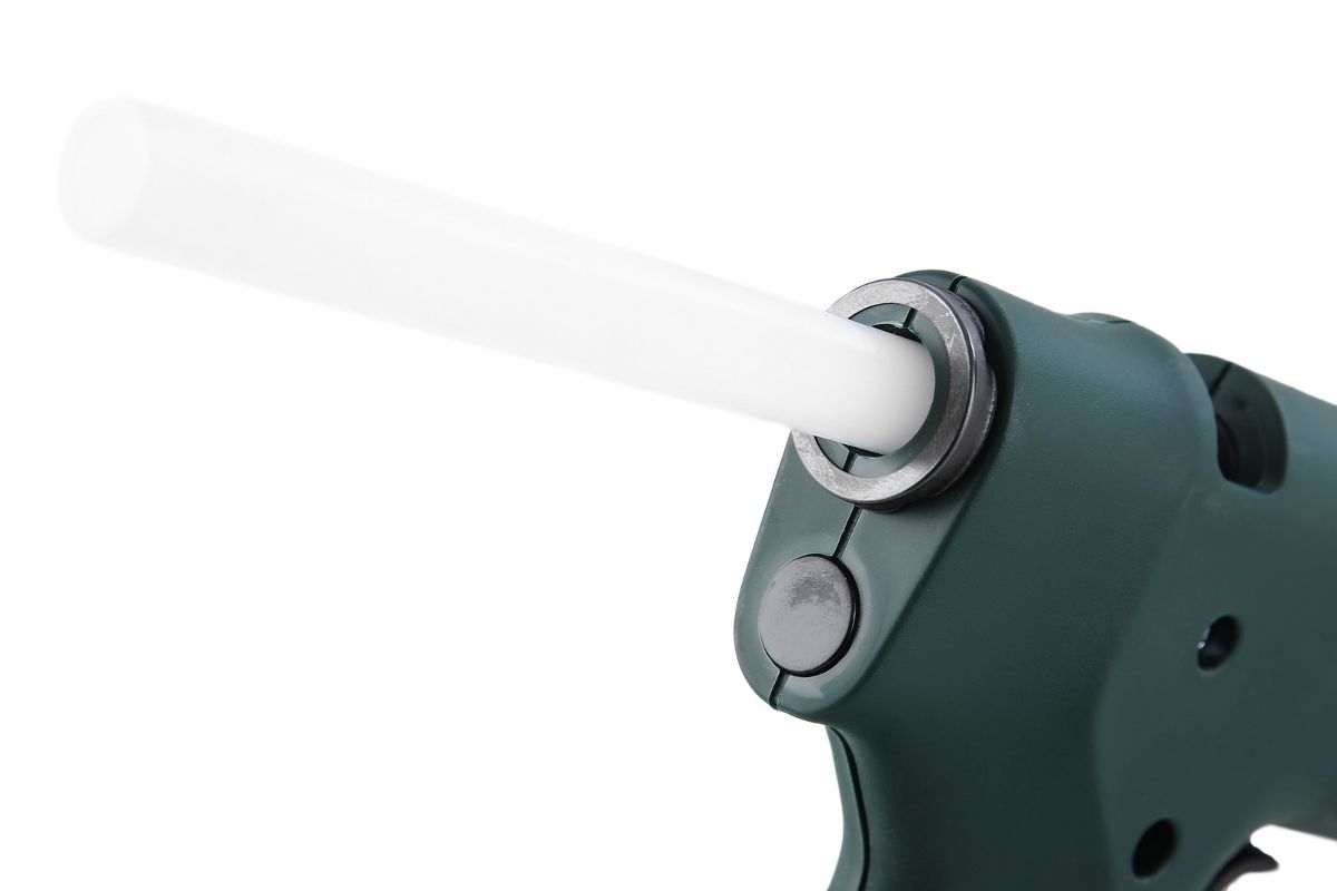 Клеевой пистолет Metabo KE 3000 работает с клеевыми стержнями шириной 11 и длиной в 200 миллиметров. Подача клеевого стержня происходит механически, а именно нажатием на большой и удобный выключатель, так что пользователь всегда сможет контролировать работу и точно дозировать клей, нанося его там, где это необходимо. Наконечник клеевого пистолета рассчитан на постоянное поддержание нужной температуры, поэтому качественно будет производиться каждое склеивание. Кроме того, сопло клеевого пистолета Metabo KE 3000 имеет шариковый затвор, который предотвратит утечку клея. Так как после использования клей не капает и не засыхает, работа с этим клеевым инструментом будет удобной и чистой. Безопасно хранить инструмент в перерывах между использованием поможет проволочная передняя скоба и опорная поверхность на корпусе инструмента.