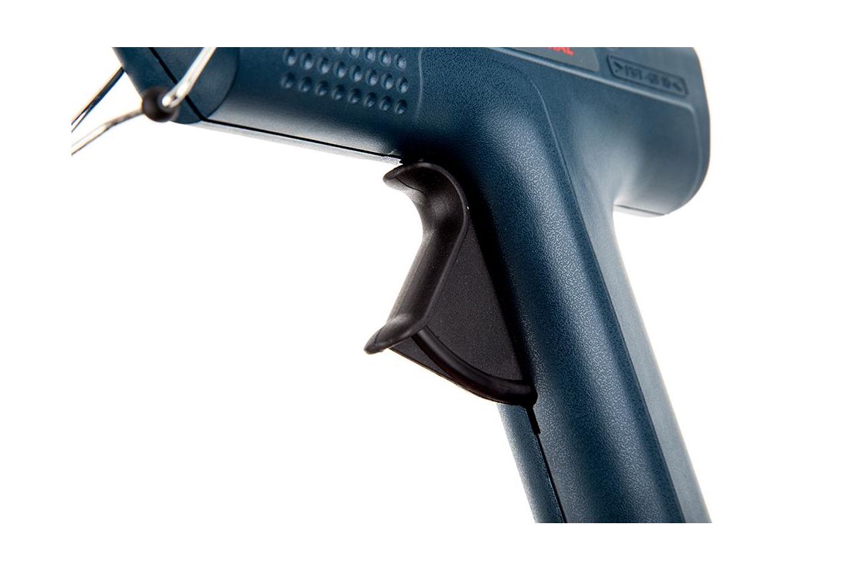 Данный электроинструмент рассчитан на использование термоклеевых карандашей диаметром 11 и максимальной длиной 200 мм (в комплект входит 8 шт.). Благодаря тому, что в конструкции используется два нагревательных элемента, а не один, как обычно, пистолета обладает повышенной производительностью, составляющей 30 г растопленного клея в минуту. Для точности дозирования клея предусмотрена ручная подача расплава на место склейки. Конструкция форсунки с термокожухом исключает образование во время паузы в использовании пистолет пробки из застывшего клея и его капания во время работы.
