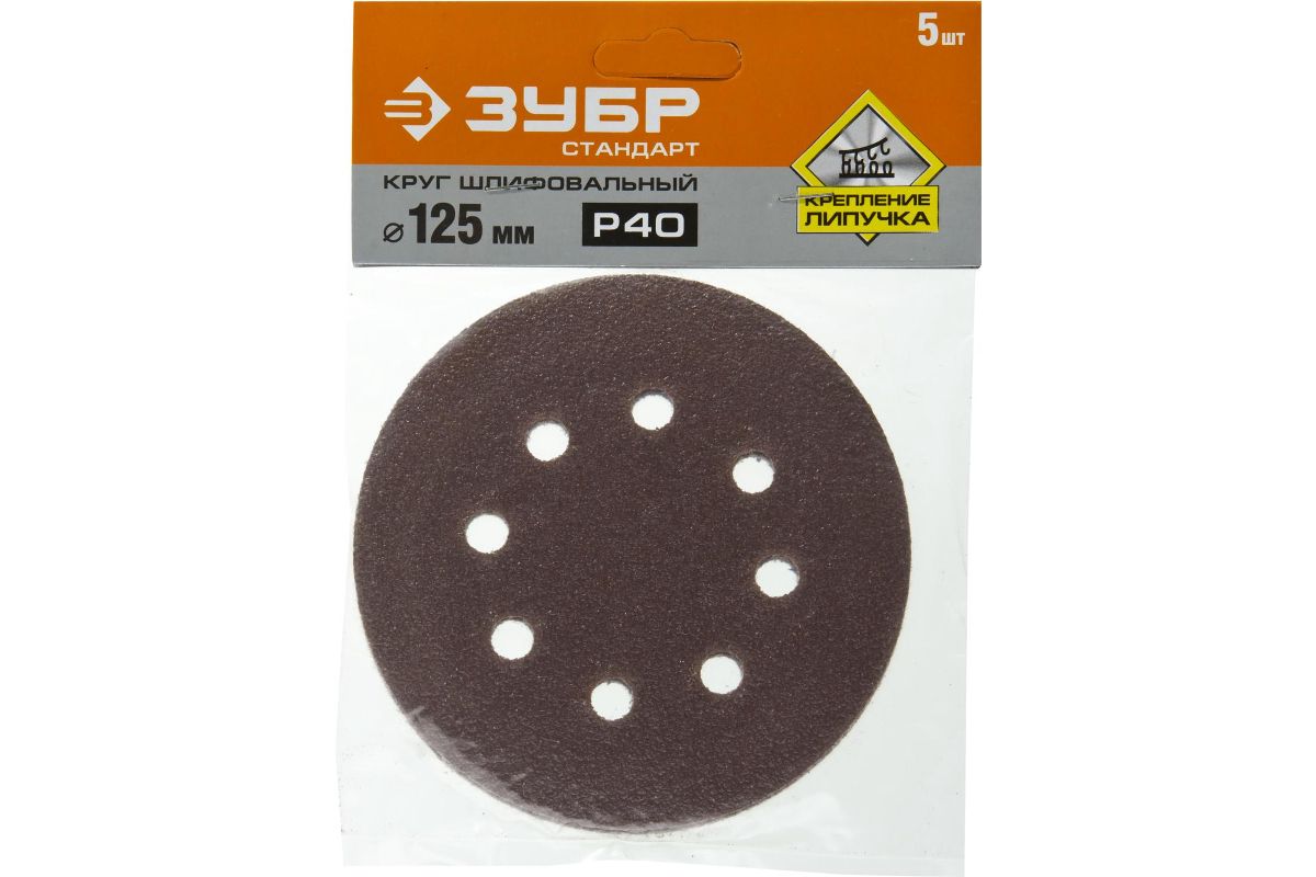 Круг шлифовальный ЗУБР 35350-125-040 из абраз. бумаги на велкро основе 8 отв. р40 125мм 5шт