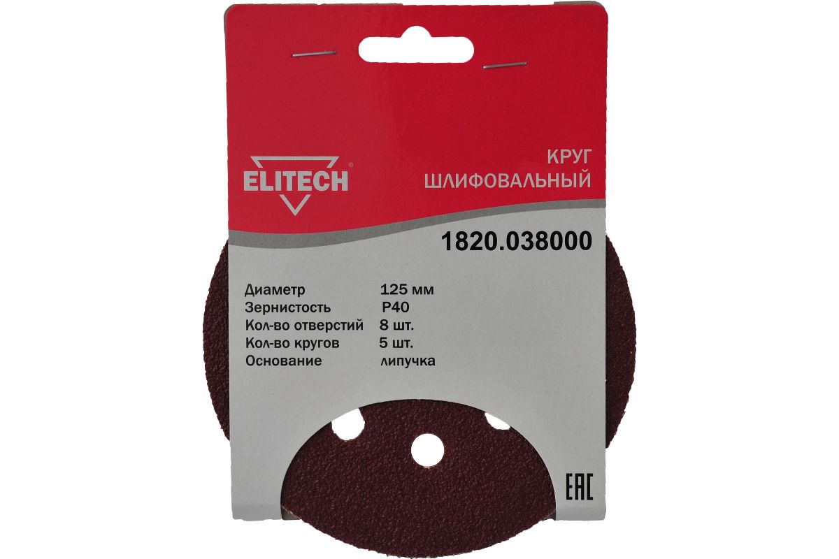 Круг шлифовальный ELITECH 1820.038000 Шлифкруг,липучка,8отв,ф125мм,P40,5шт,д\дерева,металла