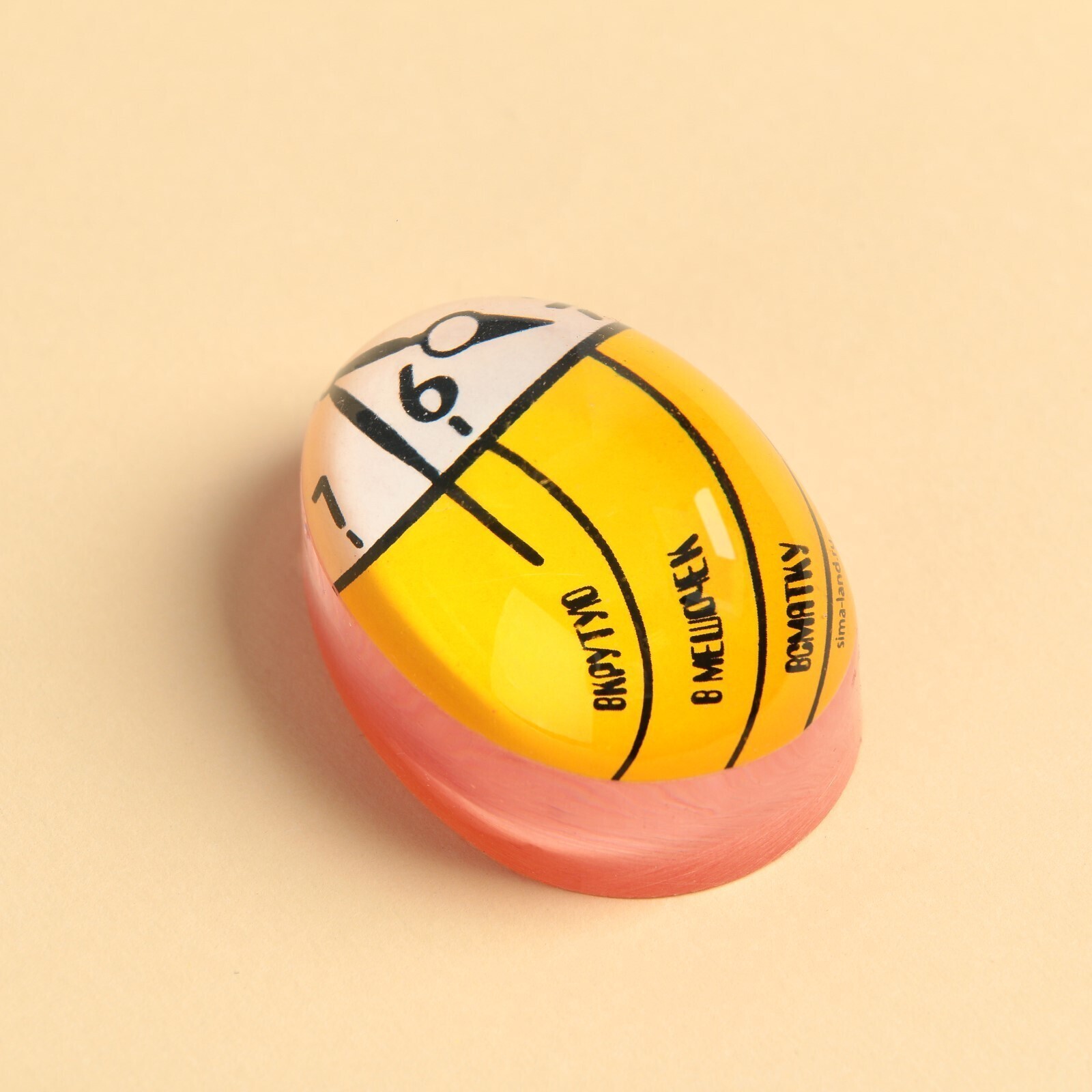 Индикатор приготовления яиц изготовлен из плотных безопасных материалов и по форме близок к размеру обычного яйца. Поэтому, по накоплению температуры, он сравним с куриными яйцами. Внутри него находится специальный материал, который в зависимости от температуры меняет свой цвет.