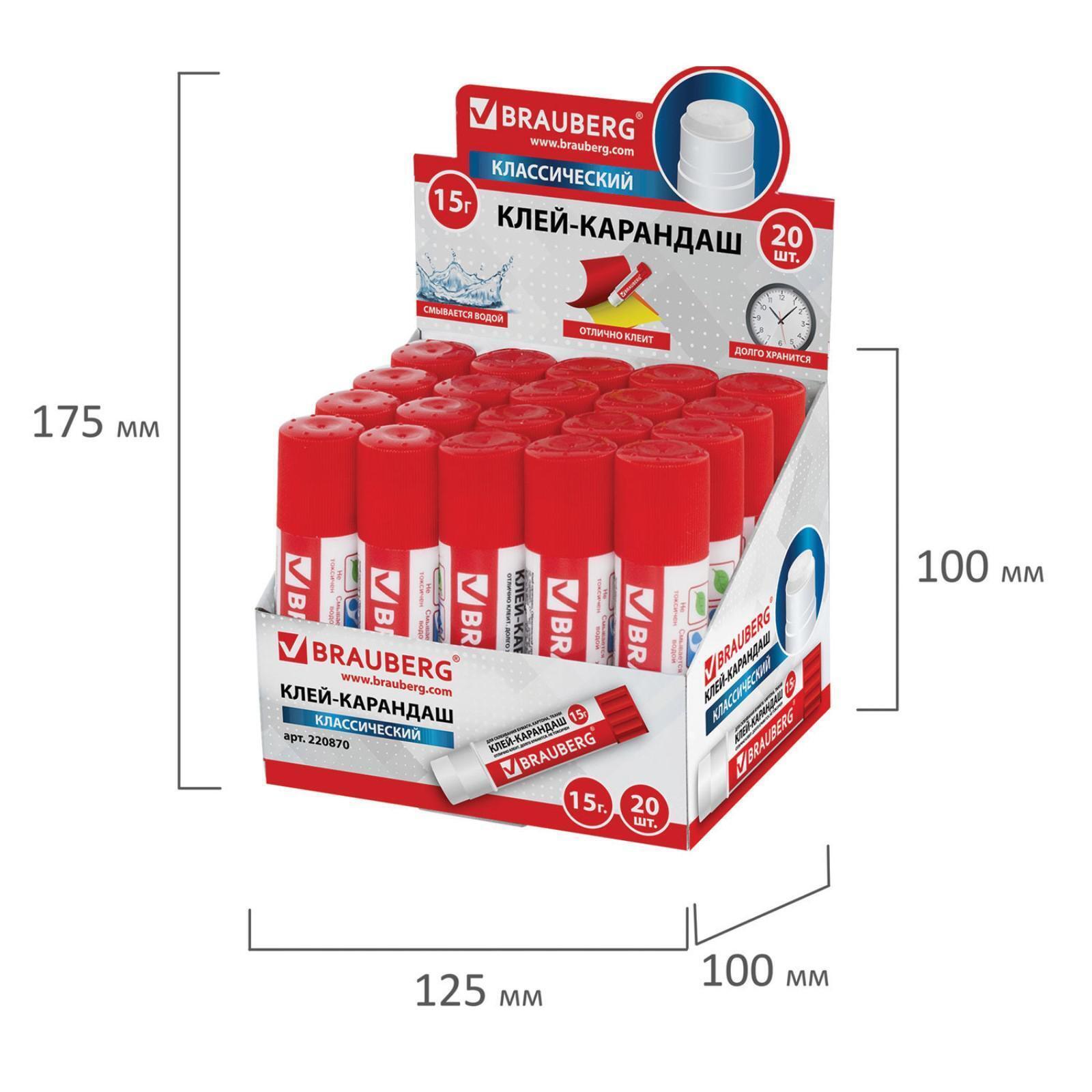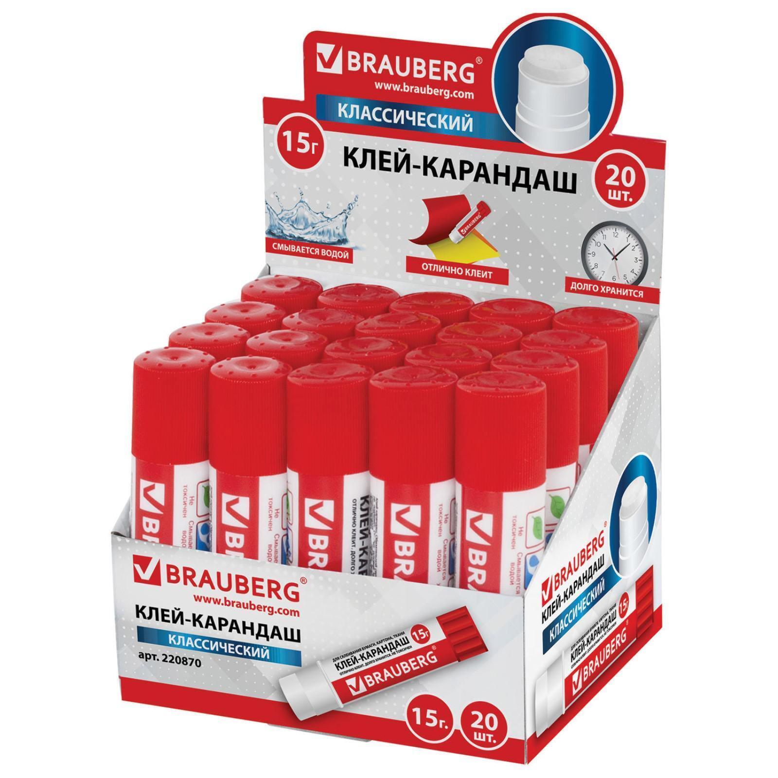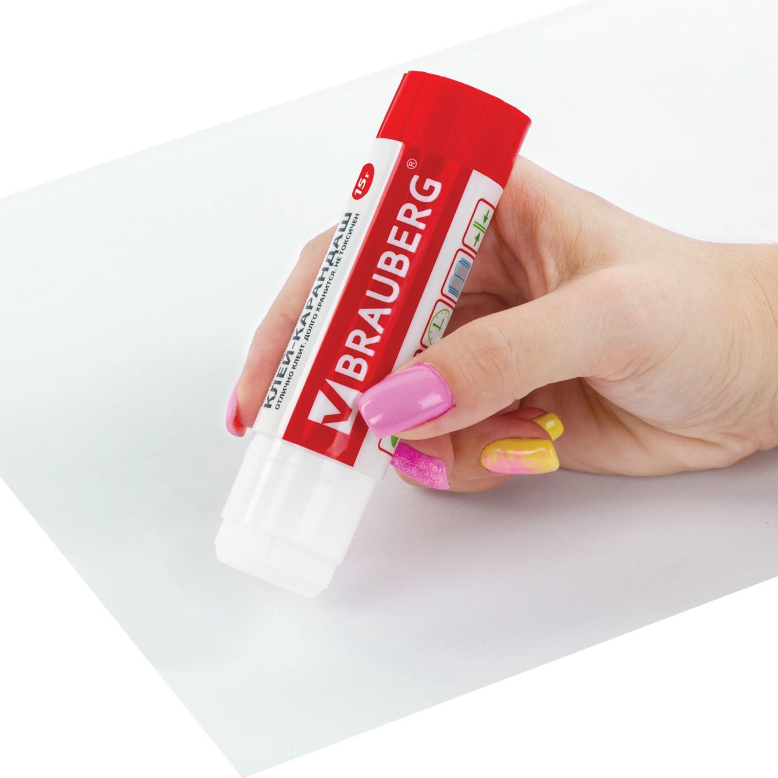Клей-карандаш BRAUBERG гарантирует надежное склеивание бумаги, картона и фотобумаги. Идеально подходит для офиса, дома и школы. После нанесения высыхает без образования пятен. Не токсичен, не вызывает аллергии и безопасен для здоровья. Легко наносится и распределяется по поверхности, оставляя тонкий и ровный клеевой слой, что позволяет расходовать его экономично. Клей удобен в использовании. Он не пачкает руки, стол, одежду, не попадает на участки бумаги, расположенные возле места склеивания. Обеспечивает быстрое и надежное склеивание. Оптимальный объем — 15 г. Увеличенный срок годности — 5 лет.