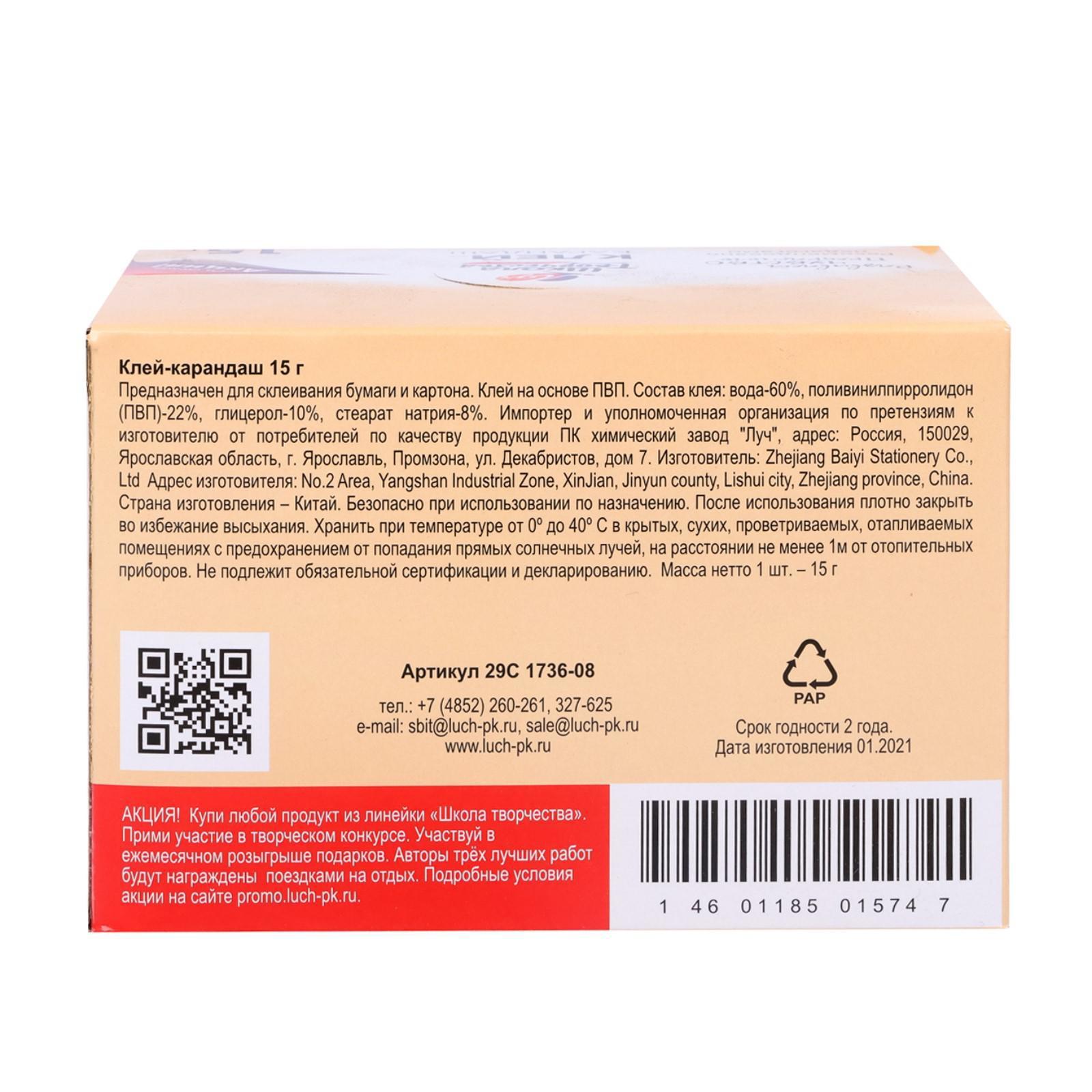 Клей-карандаш PVP 15 г Луч «Школа творчества»
