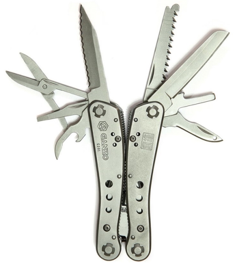 - Инструменты ножи с гладкой и серрейторной заточкой, пила, открывалка для консервов, ножницы, шило, две небольшие плоские отвертки