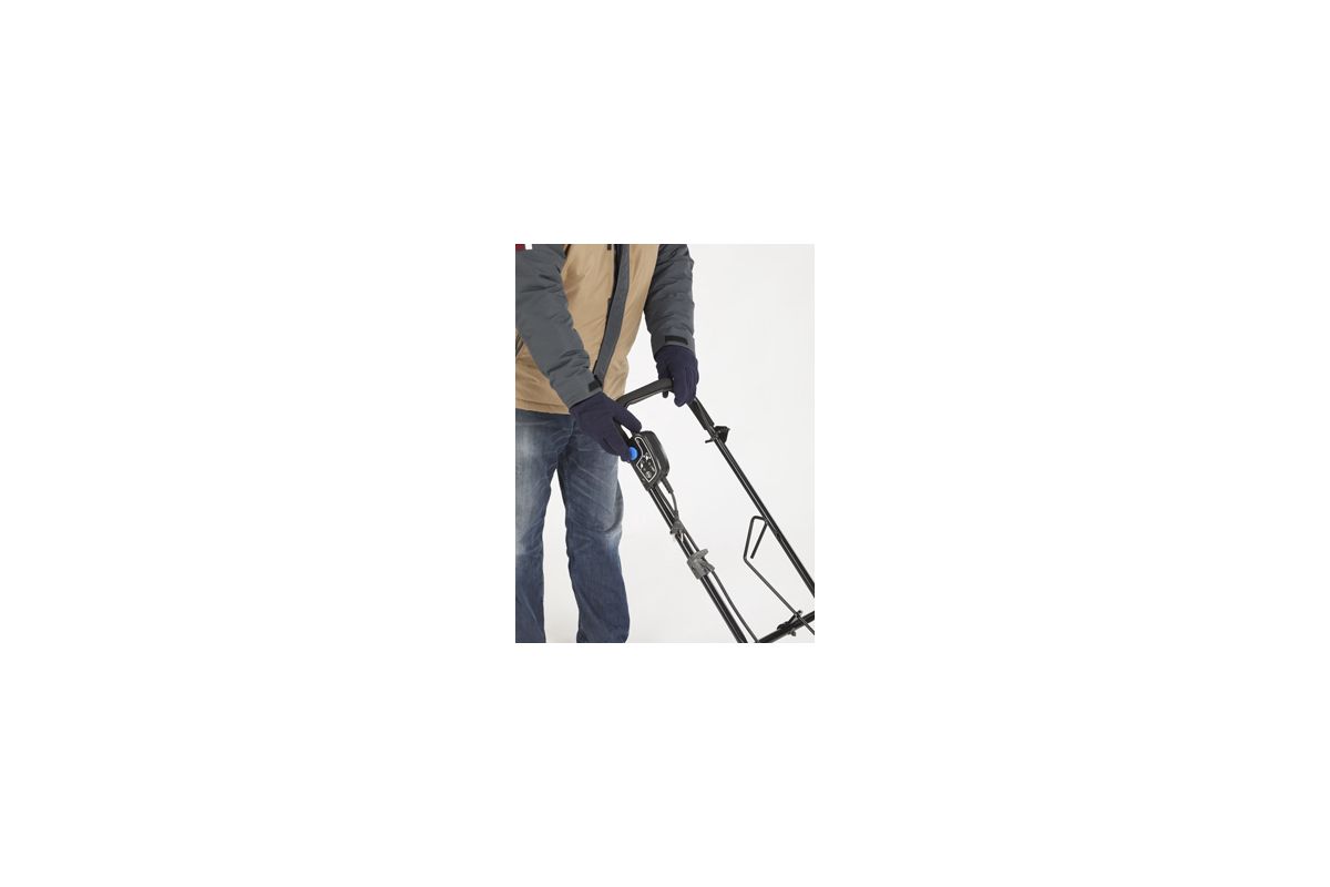 Снегоуборщик несамоходный, но благодаря небольшому весу и маневренным колесам, управлять им легко. Рукоятка эргономичной формы регулируется по высоте, поэтому пользоваться этим агрегатом могут все члены семьи.