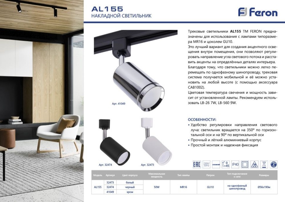 Данный светильник необходимо использовать только с шинными системами Feron. Комплектующие от других производителей могут не подойти к данному товару. Рекомендации: комплектуйте выбранные шинные системы в рамках одного производителя, одной серии и кол-ва фаз.