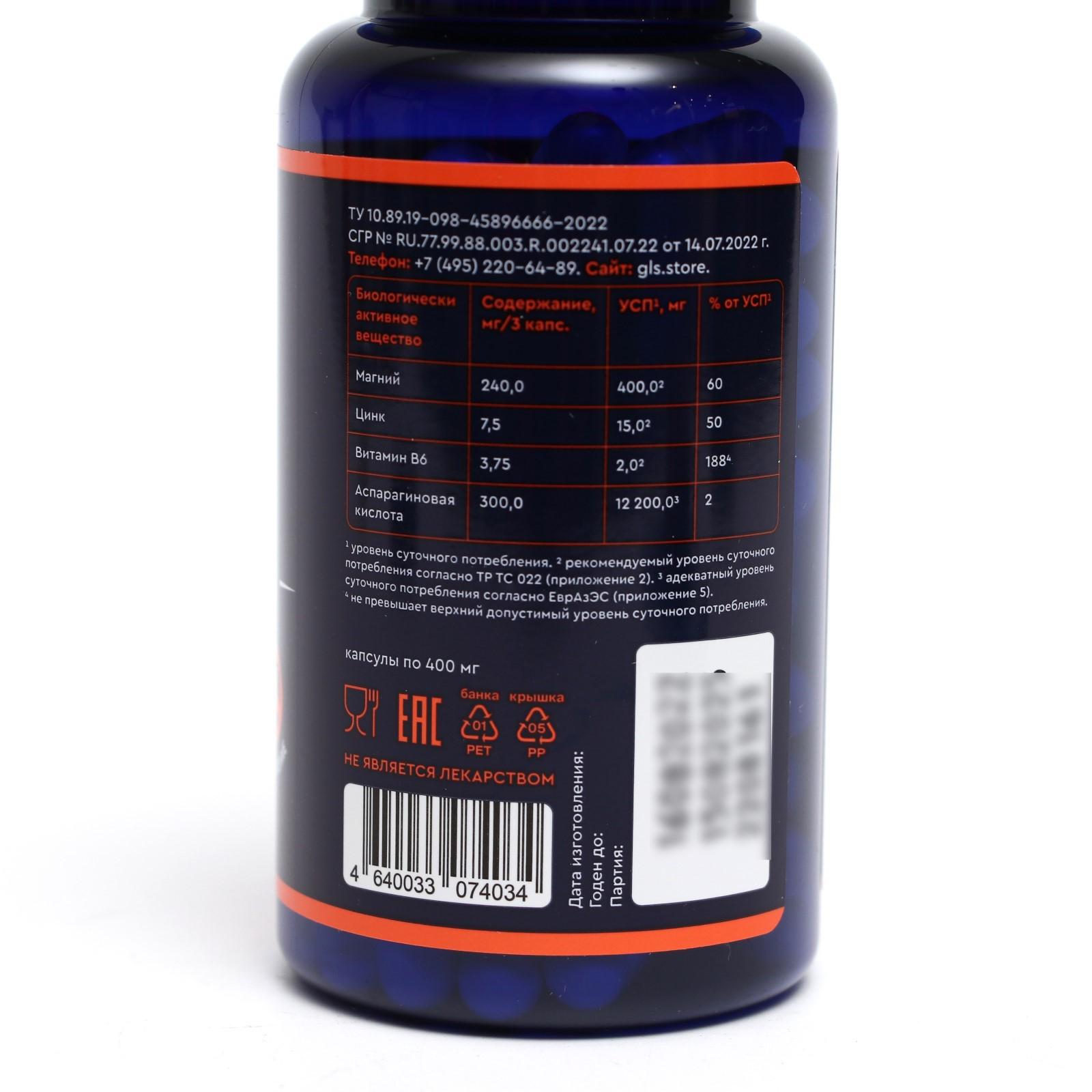 ZMA комплекс GLS с магнием, цинком и аспарагиновой кислотой, 90 капсул по 400 мг