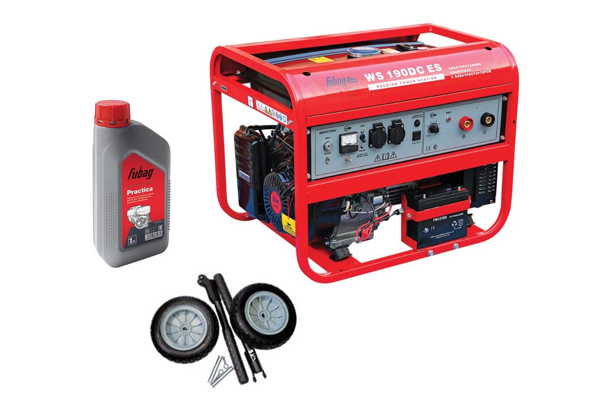 В состав набора входят: Генератор FUBAG 568209 электростанция сварочная ws 190 dc es бензиновая с электростартером, Комплект колес и ручек для электростанций Fubag (838224), Масло моторное бензиновое FUBAG Practica 838266 минеральное для 4т 1л SAE 30