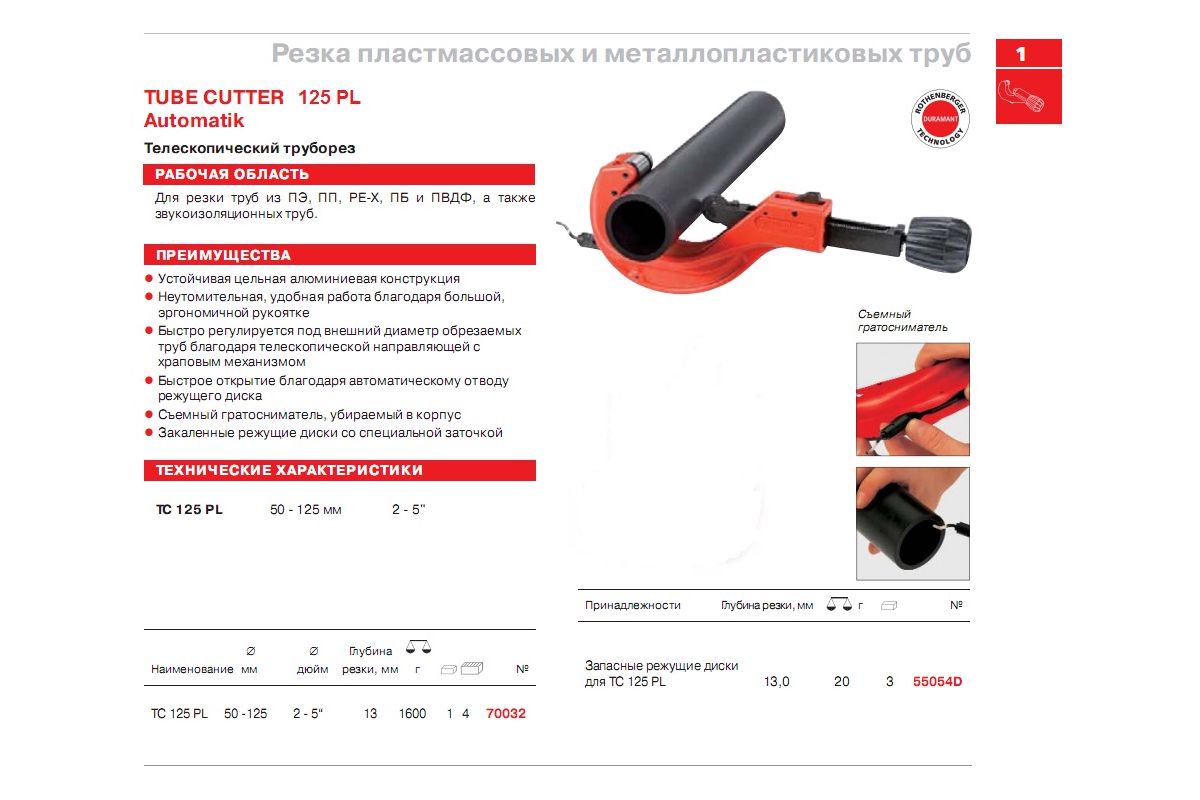 Производитель: ROTHENBERGER. АВТОМАТИК 67 PL телескопический труборез с трещоткой - наиболее часто используемый труборез для легкой и точной резки под прямым углом труб из ПЭ, ПП, PE-X, ПБ и ПВДФ, а также звукоизоляционных сливных труб и МПТ Телескопическая направляющая с трещоткой с автоматическим отводом пружины: быстрая регулировка
